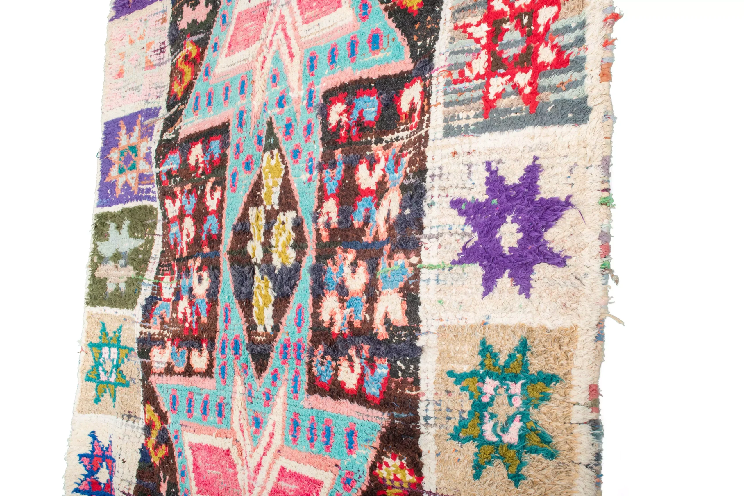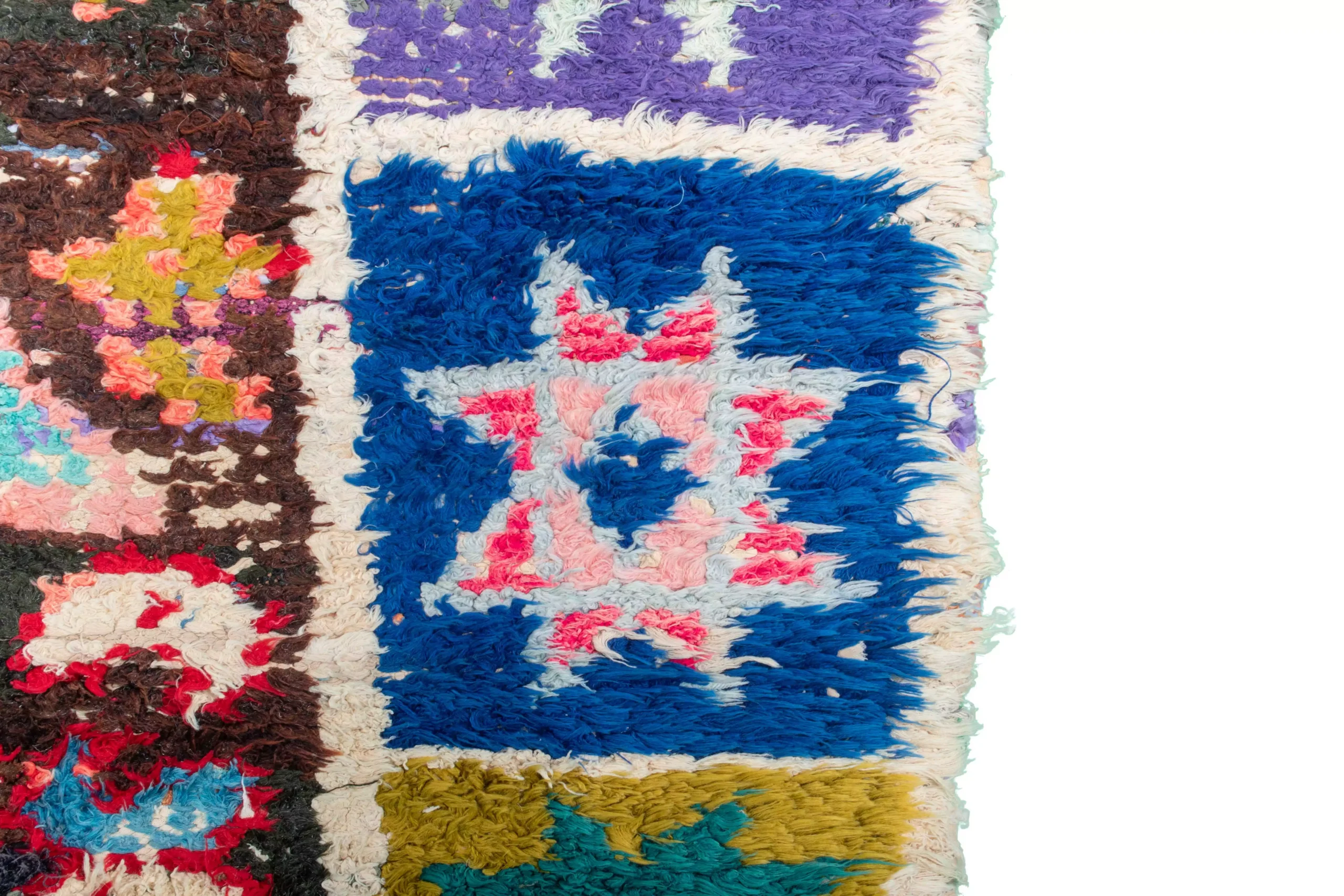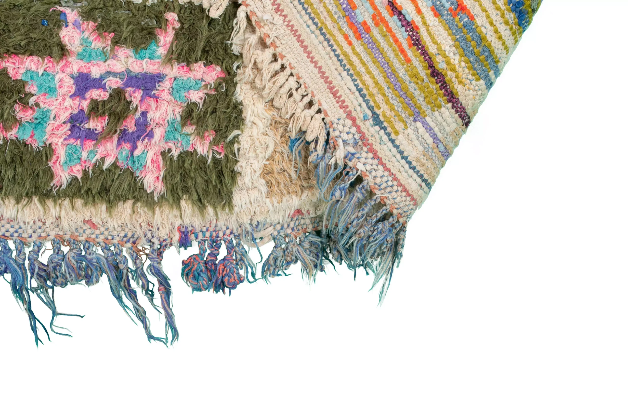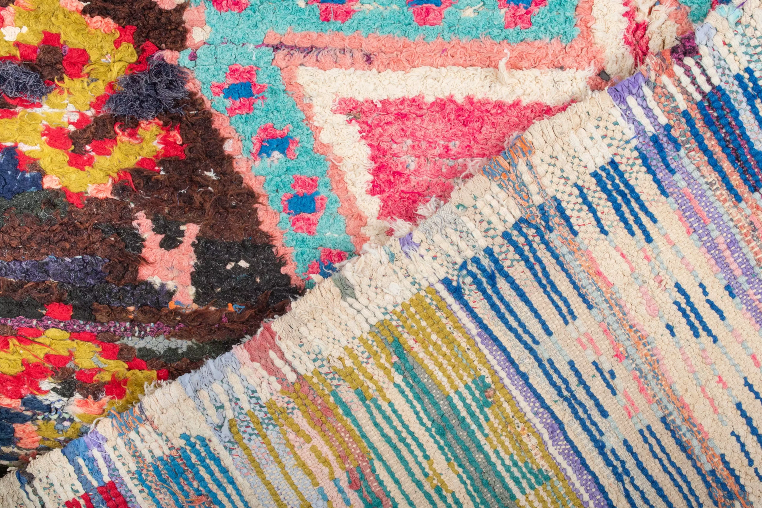 نقدم لك سجادة البوشيروايت العتيقة المزخرفة بألوان مختلطة. تتميز هذه السجادة الواسعة التي تبلغ مساحتها 10.0 أقدام × 5.2 قدم منسوجة يدوياً على يد حرفيين مغاربة بارعين باستخدام أقمشة معاد تدويرها، وهي عبارة عن سيمفونية من الألوان والنقوش، مما يجعلها قطعة أساسية لا يمكن تفويتها في أي مكان داخلي.