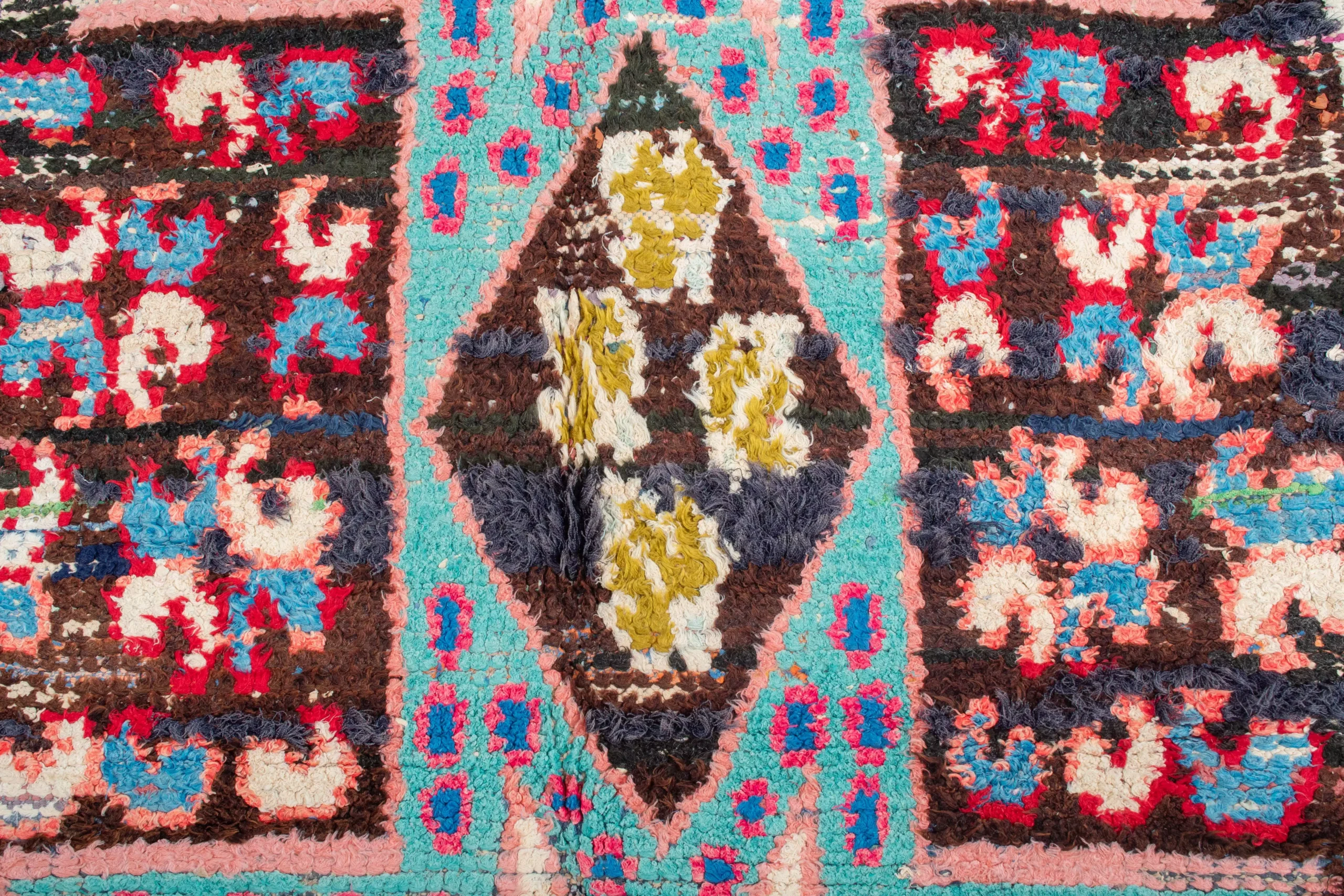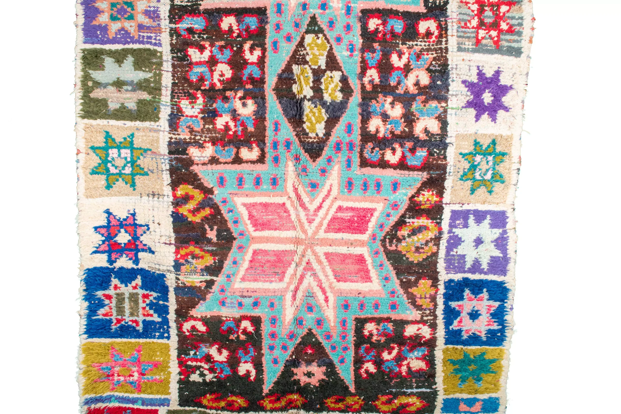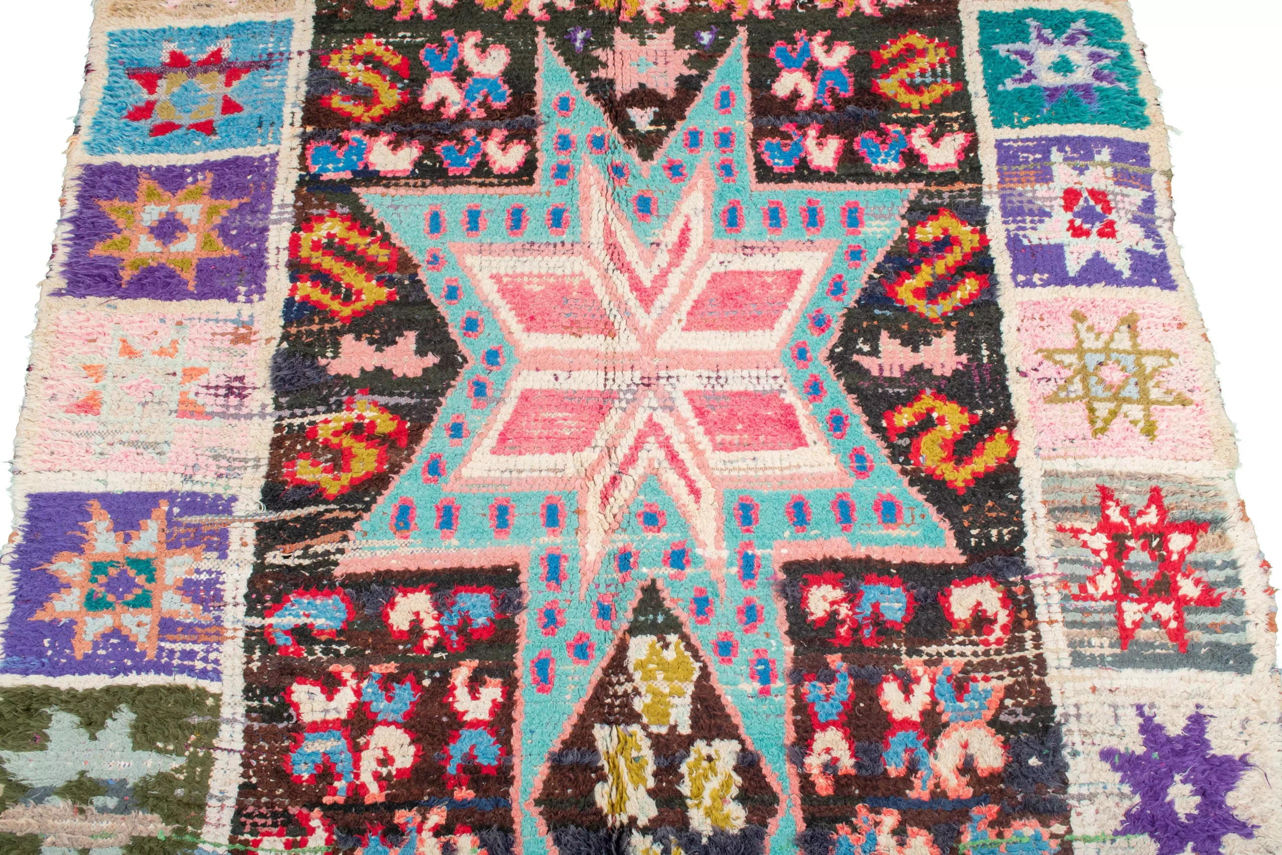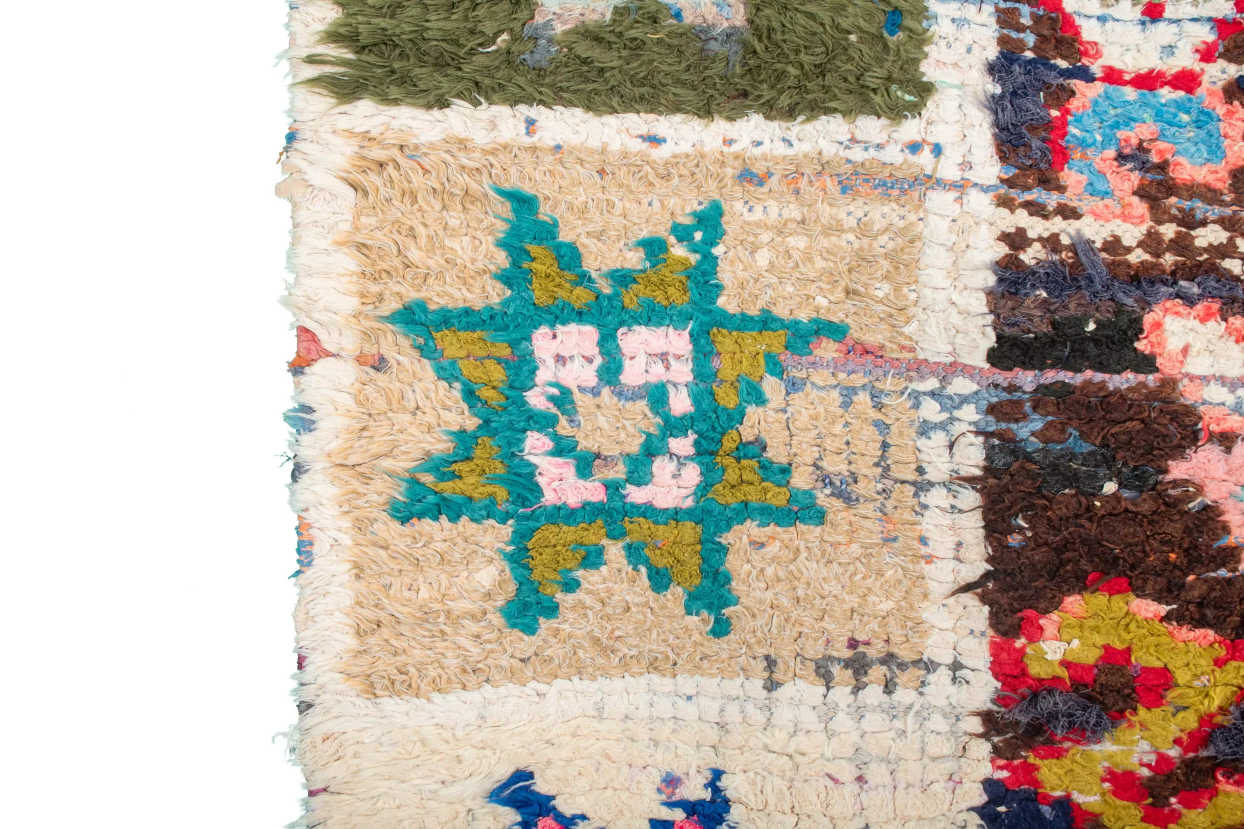 نقدم لك سجادة البوشيروايت العتيقة المزخرفة بألوان مختلطة. تتميز هذه السجادة الواسعة التي تبلغ مساحتها 10.0 أقدام × 5.2 قدم منسوجة يدوياً على يد حرفيين مغاربة بارعين باستخدام أقمشة معاد تدويرها، وهي عبارة عن سيمفونية من الألوان والنقوش، مما يجعلها قطعة أساسية لا يمكن تفويتها في أي مكان داخلي.