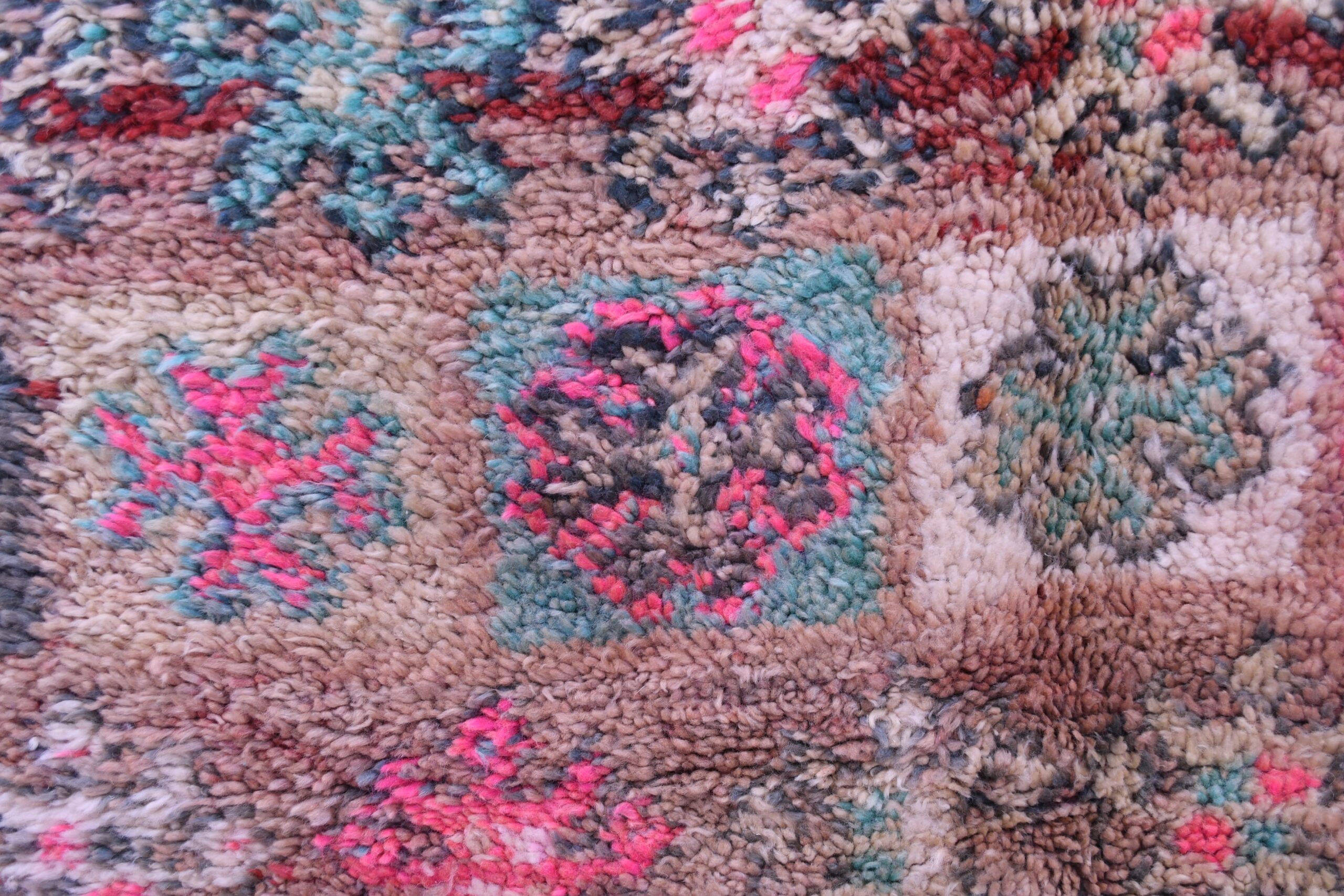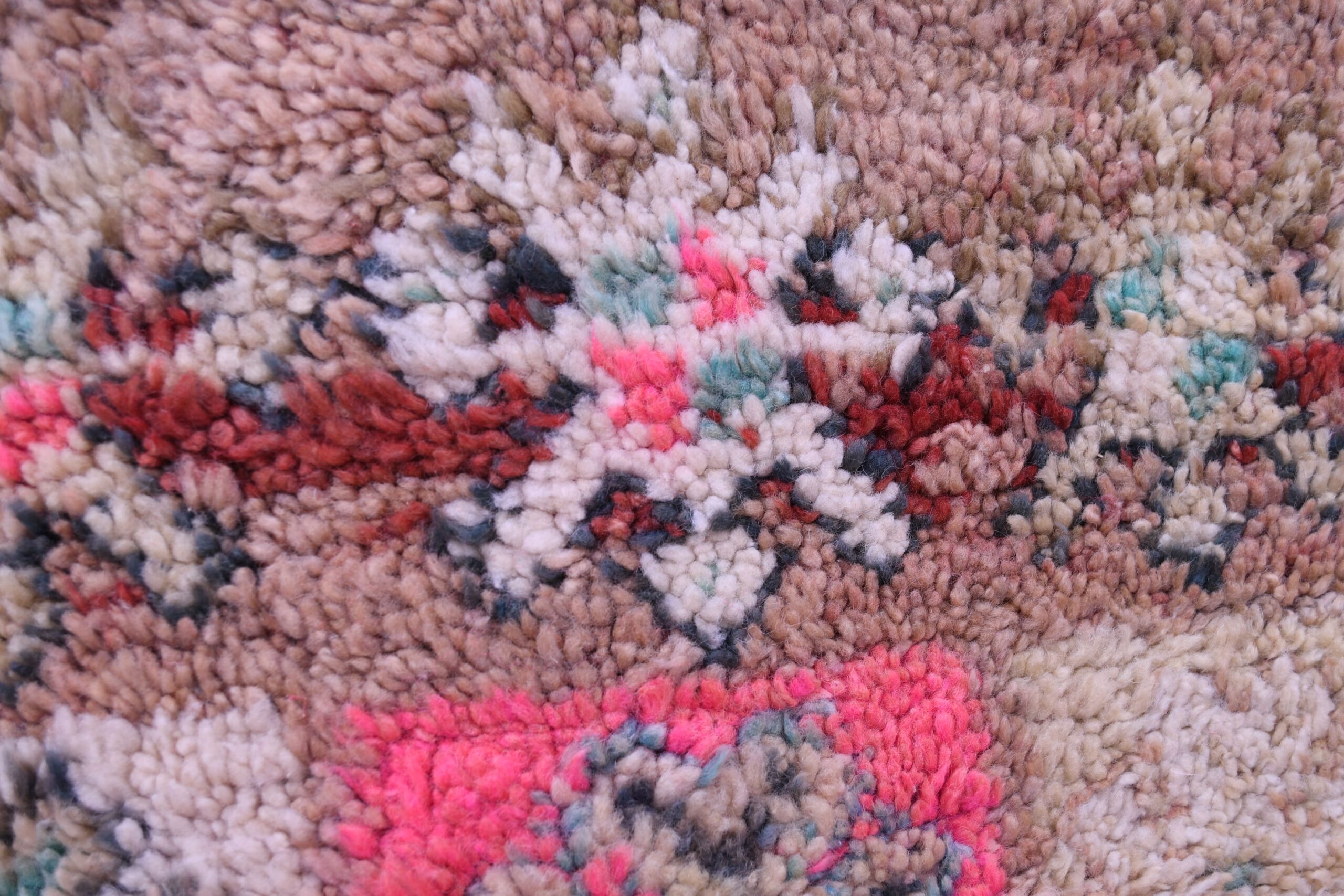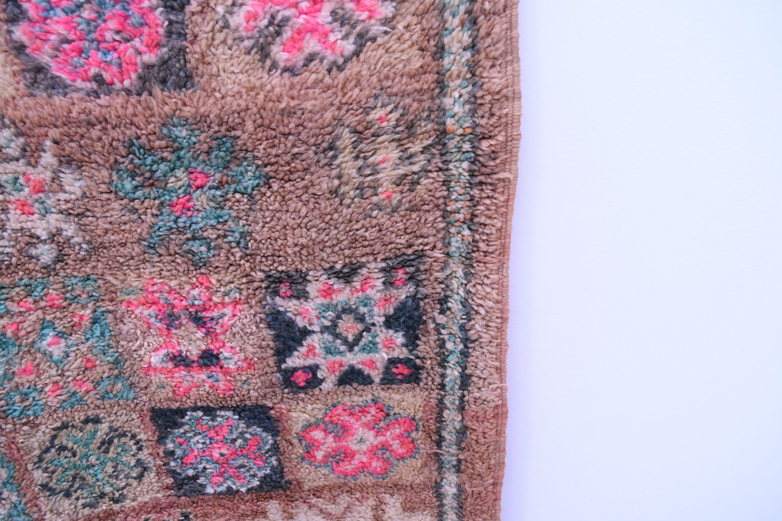 The rug features a harmonious blend of earthy tones and vibrant accents. The base colors of warm browns and beiges are beautifully contrasted with pops of pink, teal, and dark accents. This dynamic color combination not only enhances the visual appeal but also allows for versatile integration into various decor styles, from modern to traditional.