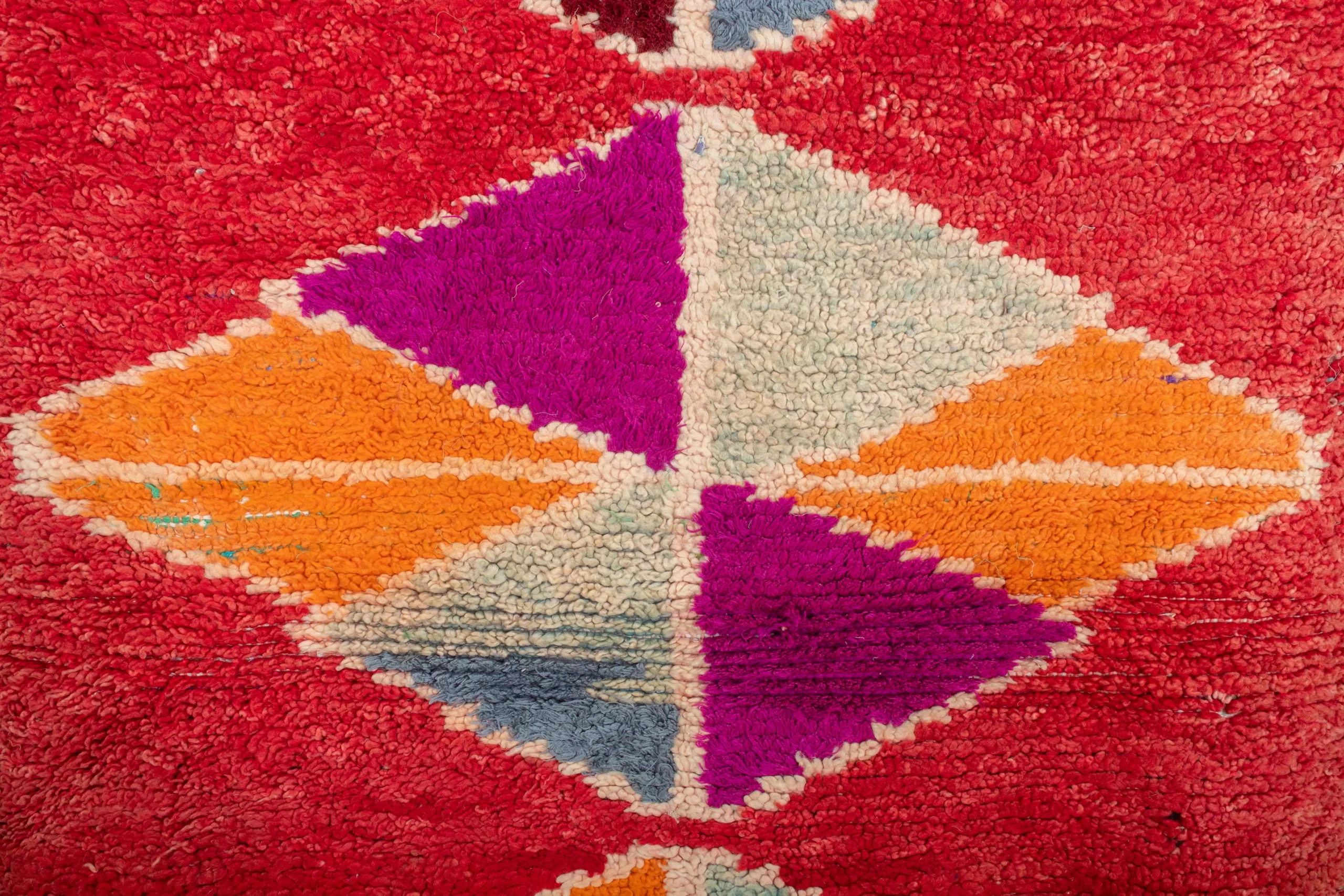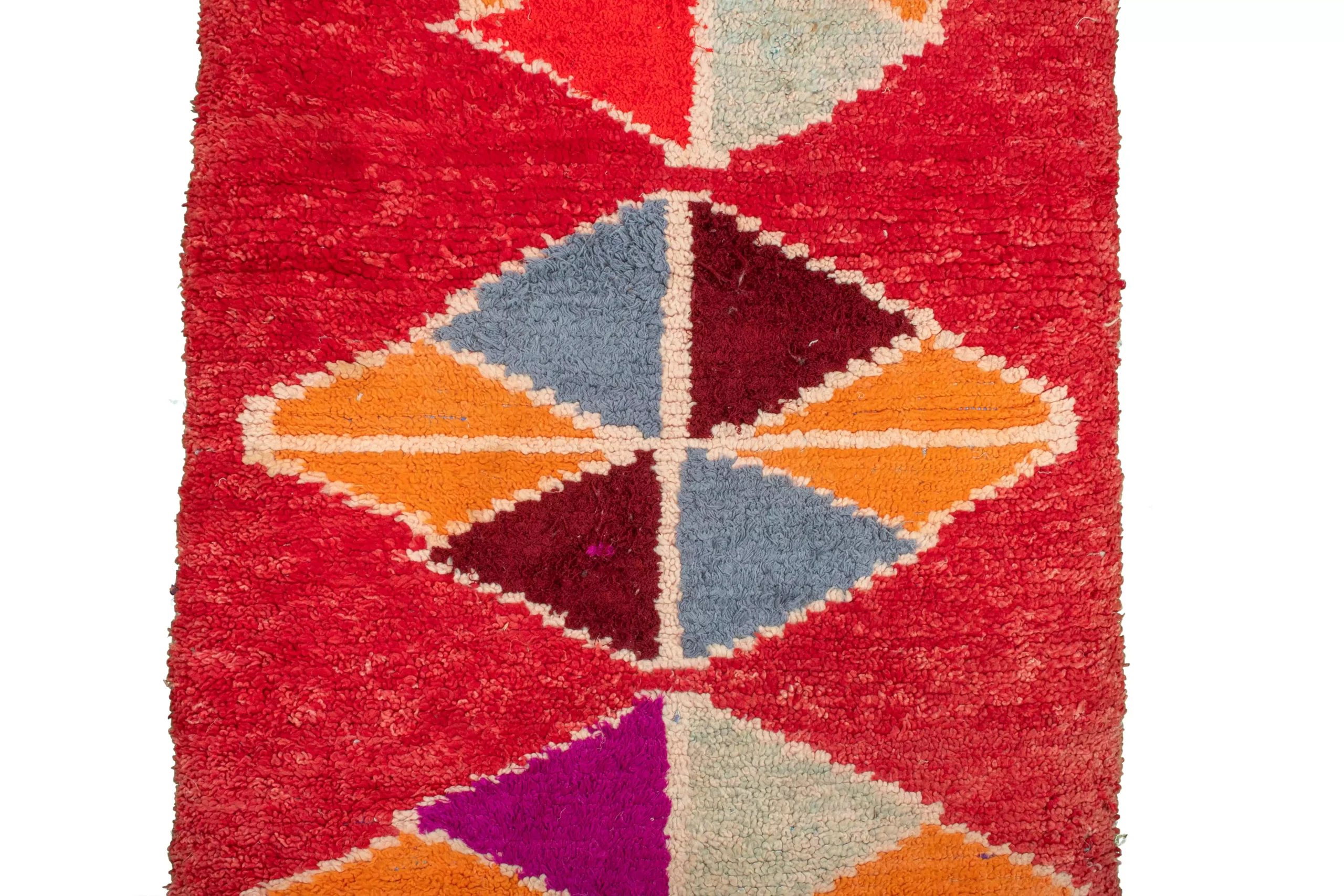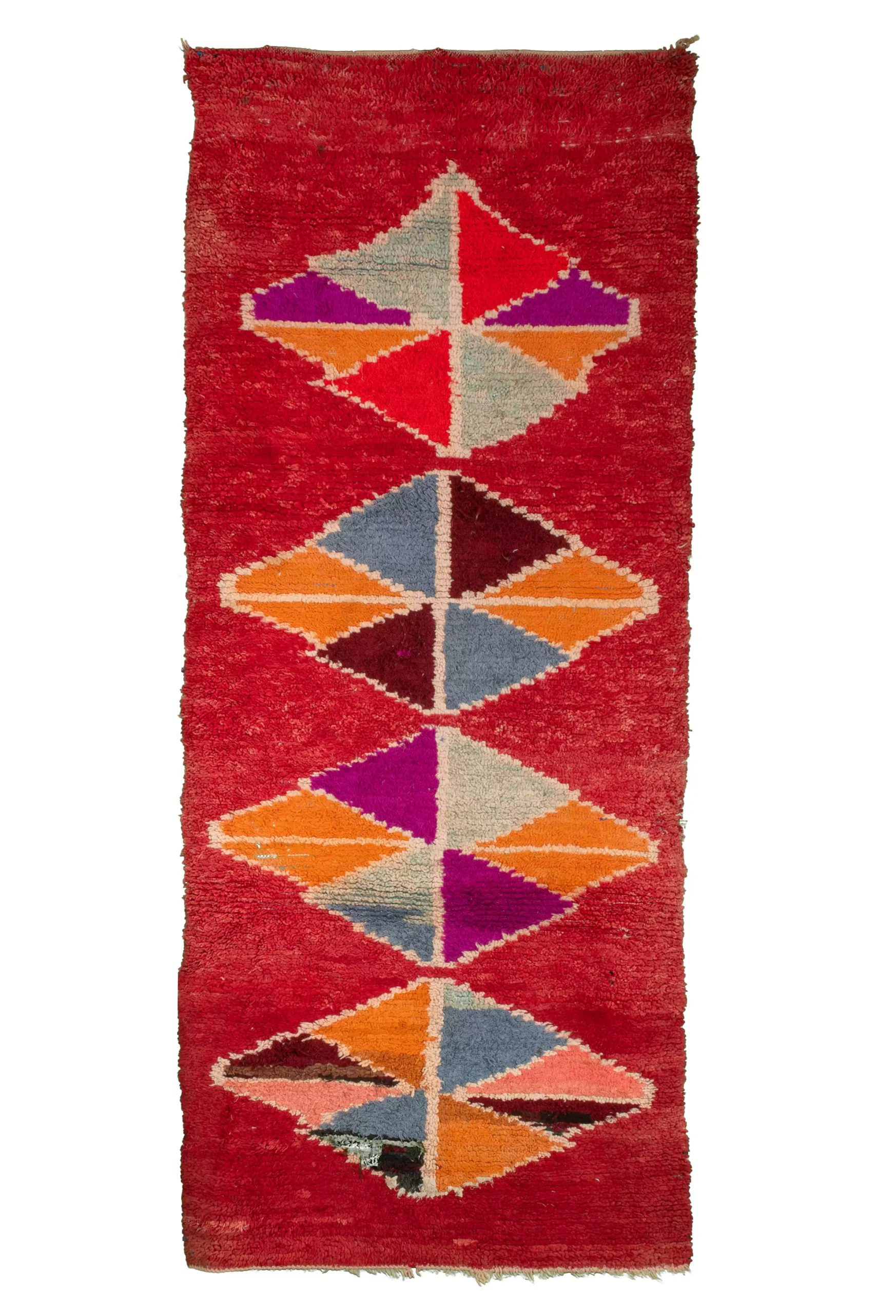 ミックスカラーのレッド・オーネート・トライアングル・ヴィンテージ・ブーシュルイット・ラグ。7.6フィート x 3.2フィートの大きさのこのラグは、モロッコの職人がリサイクル布を使って手織りしたものです。赤とミックスカラーのダイナミックなトライアングル模様は、どんな空間にも幾何学的な芸術的要素を加えます。