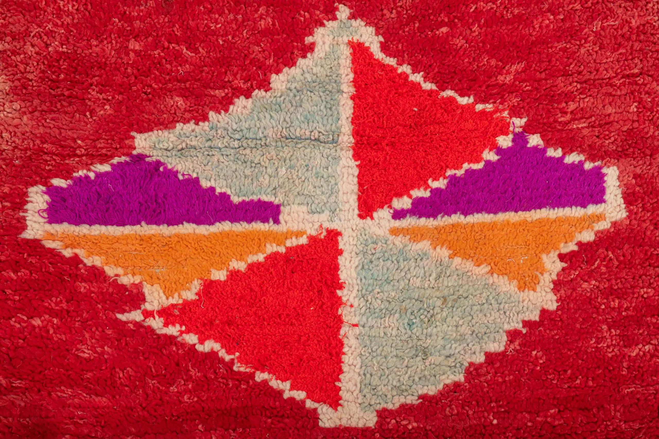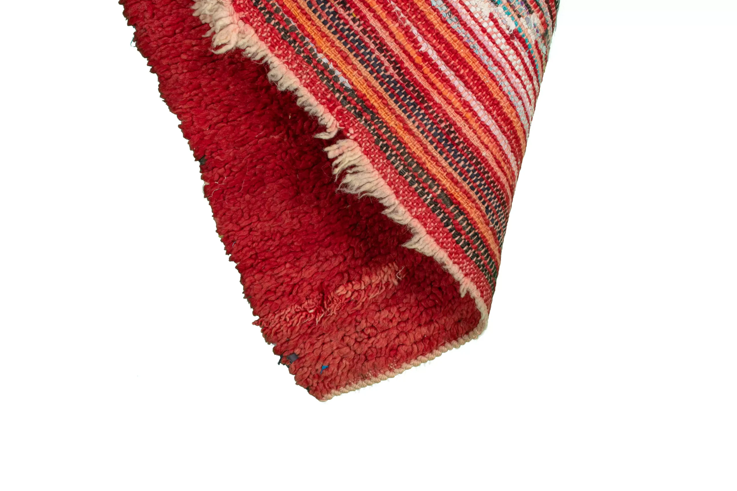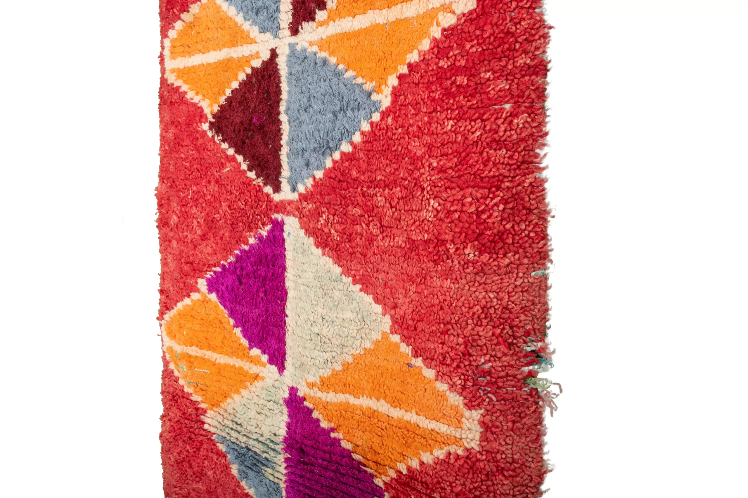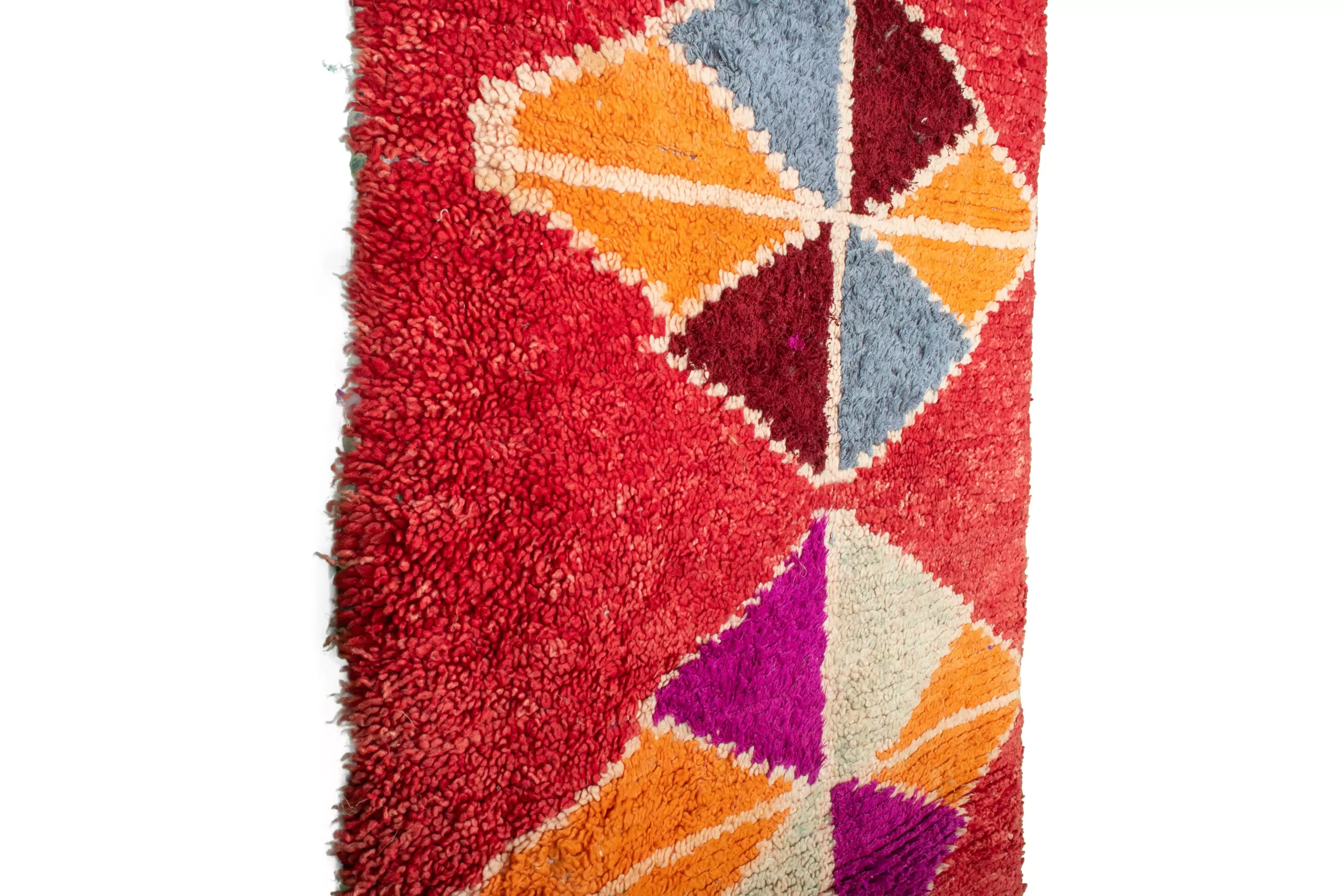 ミックスカラーのレッド・オーネート・トライアングル・ヴィンテージ・ブーシュルイット・ラグ。7.6フィート x 3.2フィートの大きさのこのラグは、モロッコの職人がリサイクル布を使って手織りしたものです。赤とミックスカラーのダイナミックなトライアングル模様は、どんな空間にも幾何学的な芸術的要素を加えます。