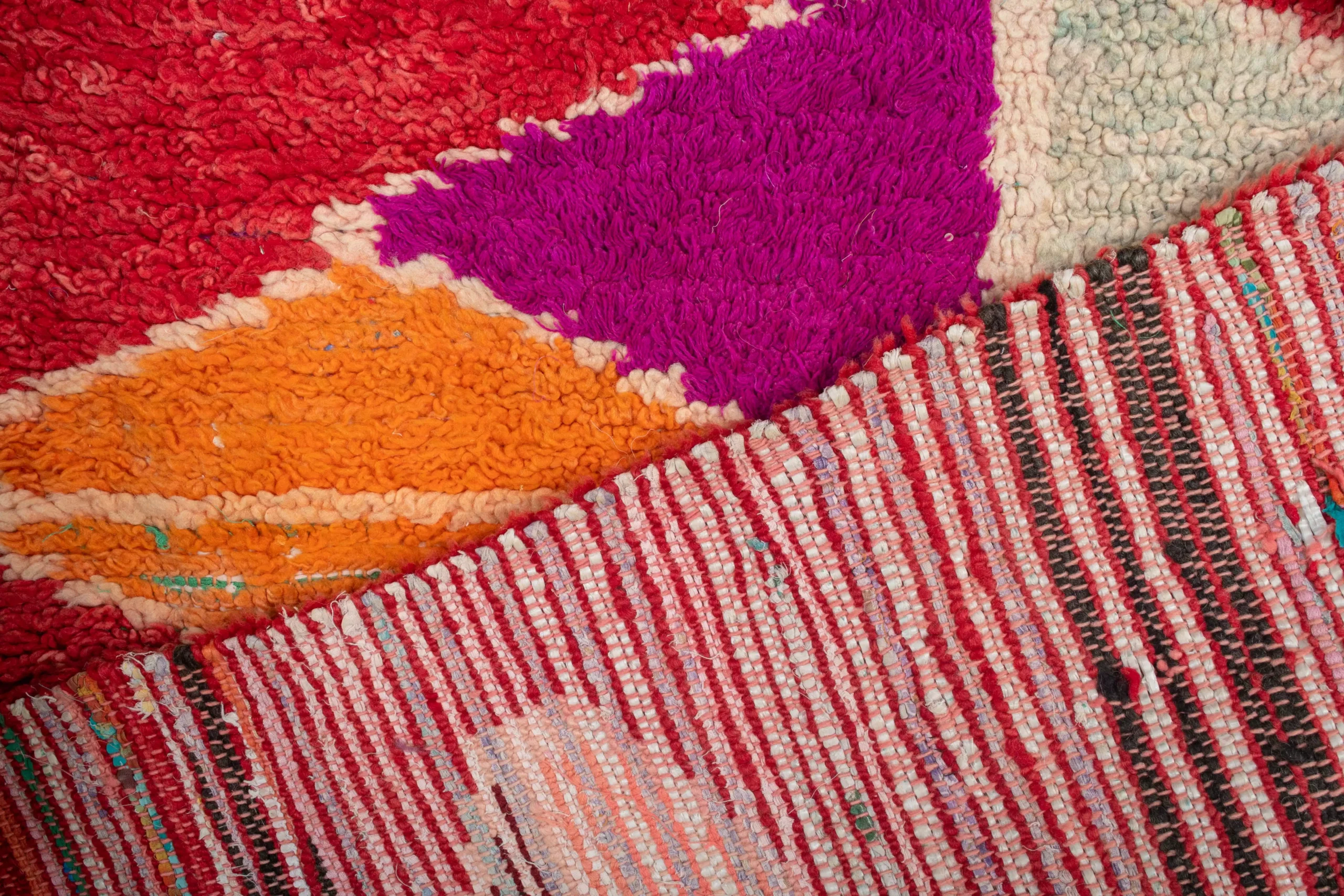 ブシュルイテ・ラグは、布の端切れを再利用して作られるモロッコの伝統的なラグです。鮮やかな色彩とユニークなデザインで知られ、職人の個性と文化遺産を反映した一点ものの作品です。
