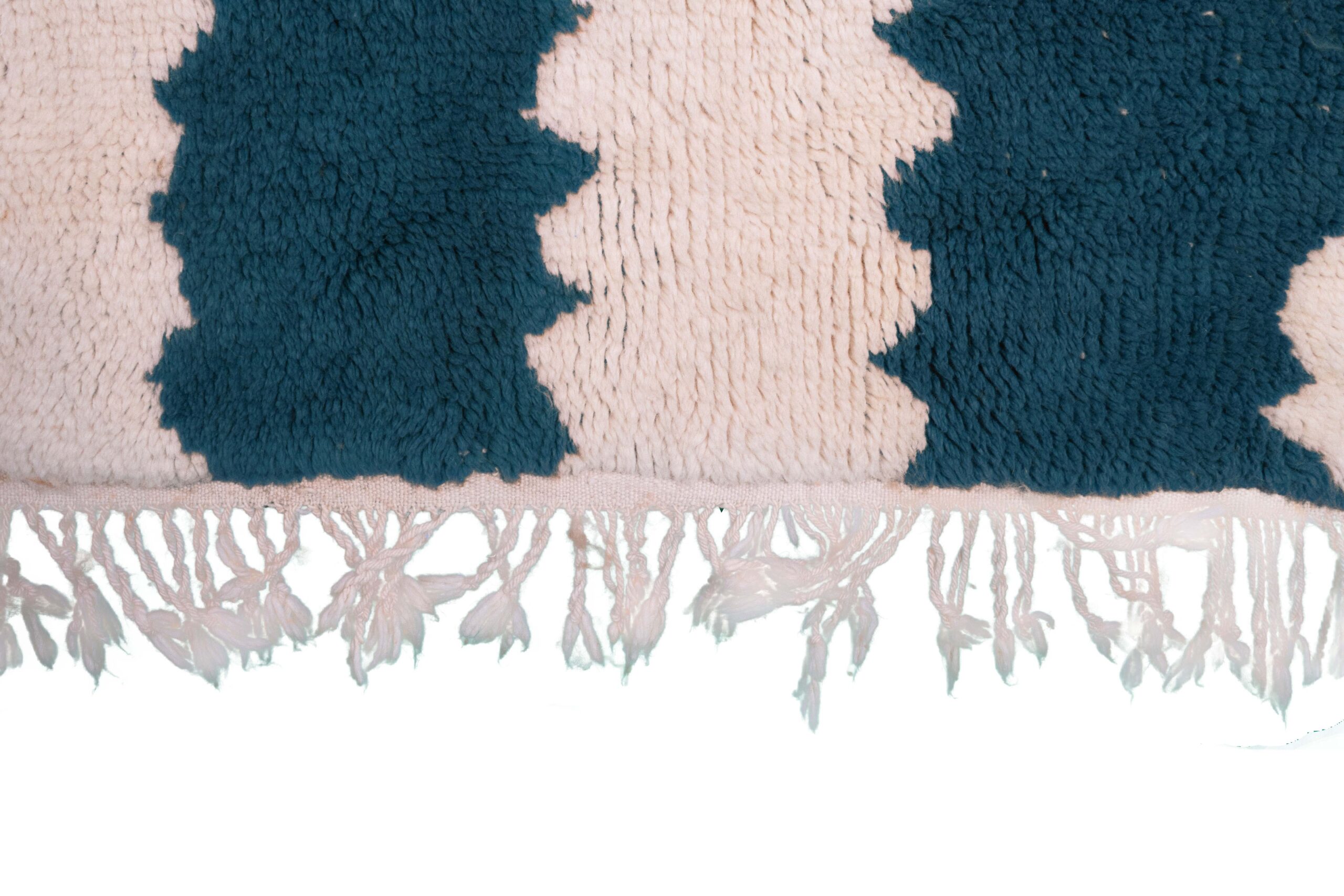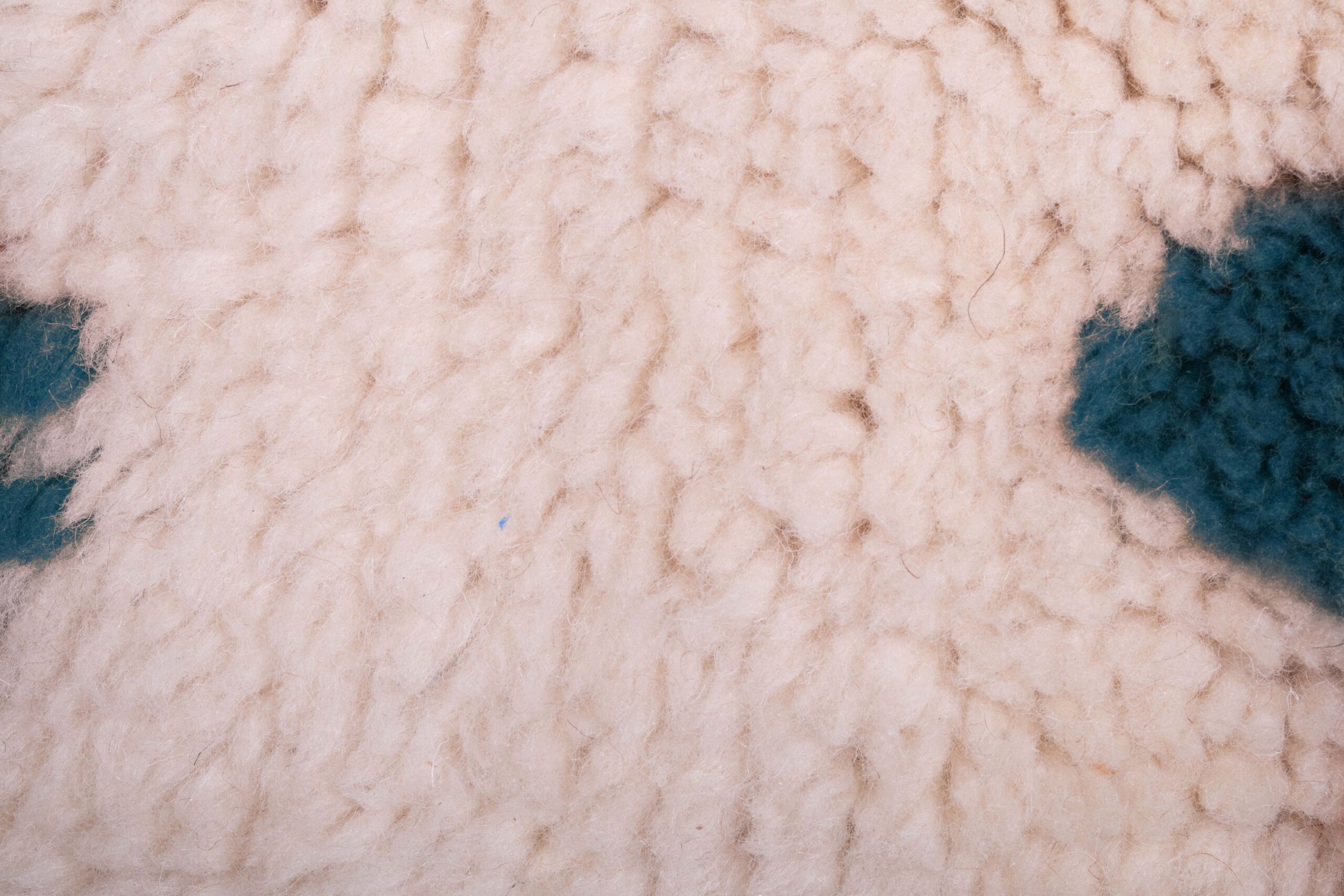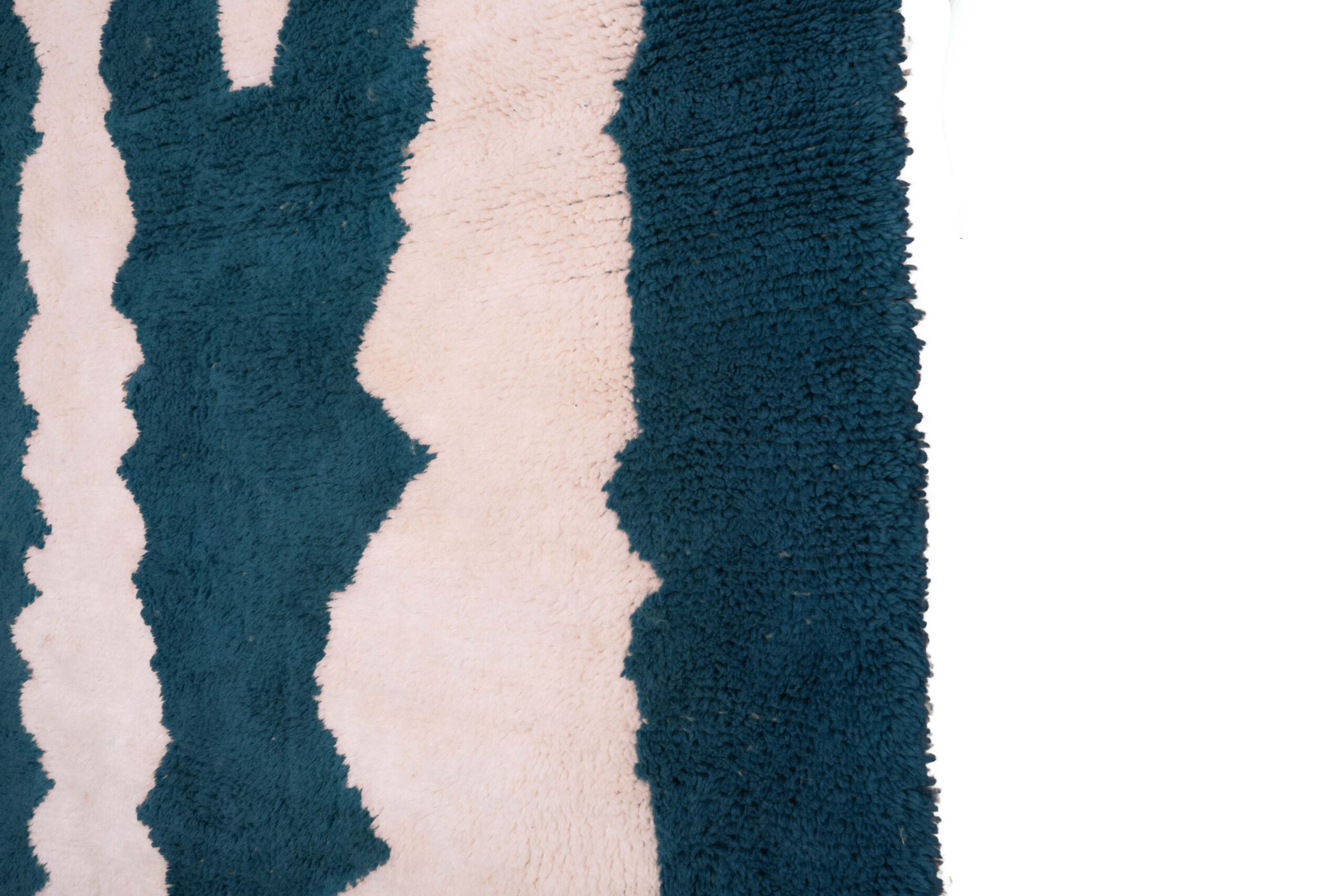 The Blue Azure and White Modern Moroccan Rug is handcrafted to order, requiring 3 to 5 weeks for production. Larger or more intricate designs may take additional time.