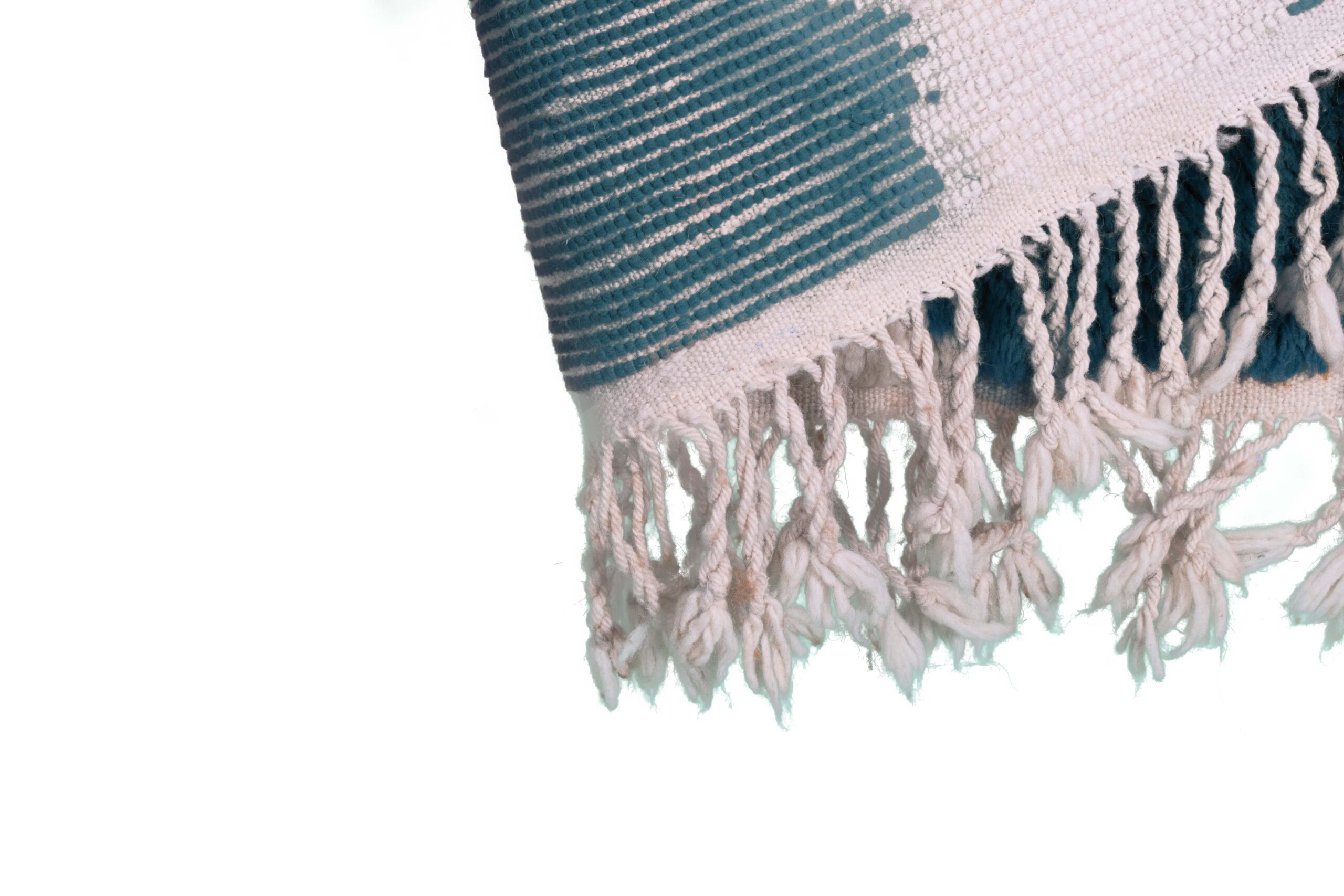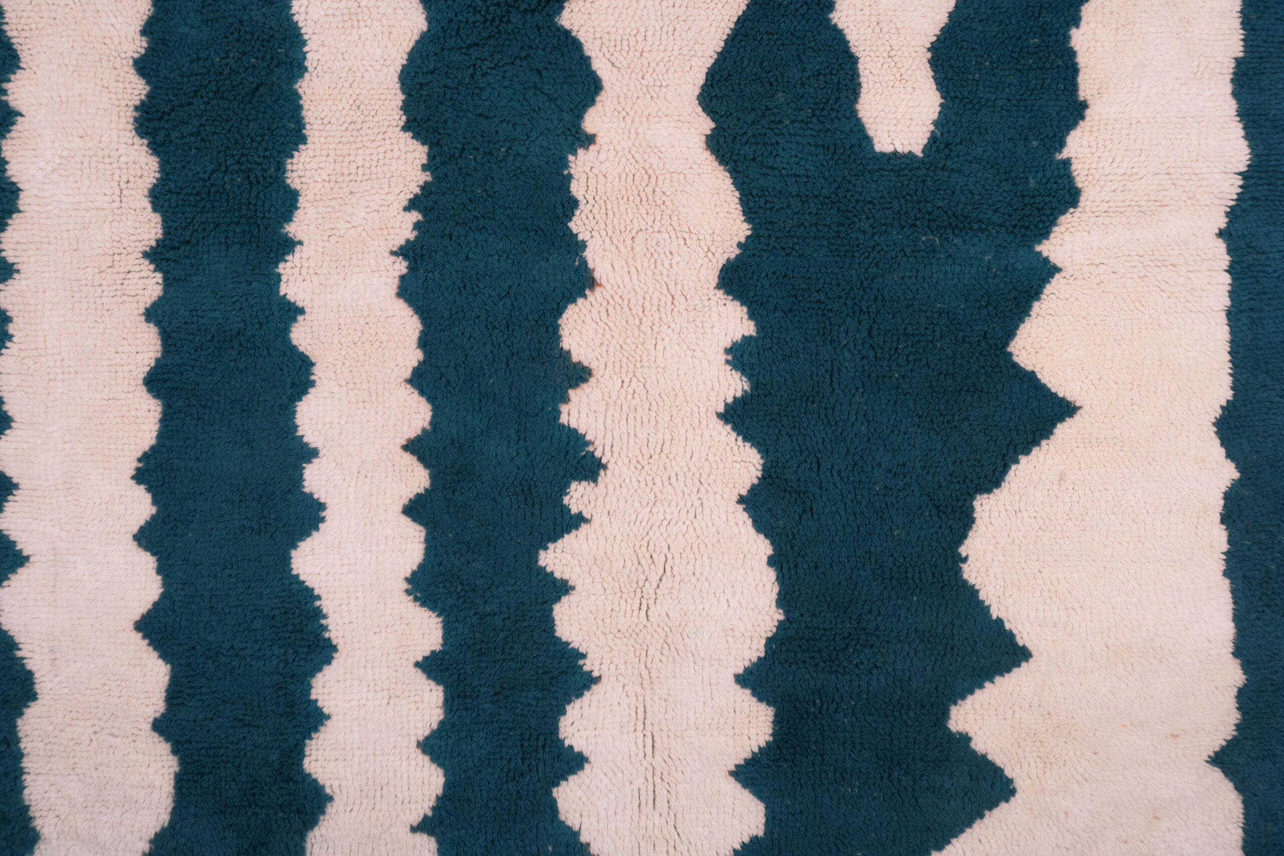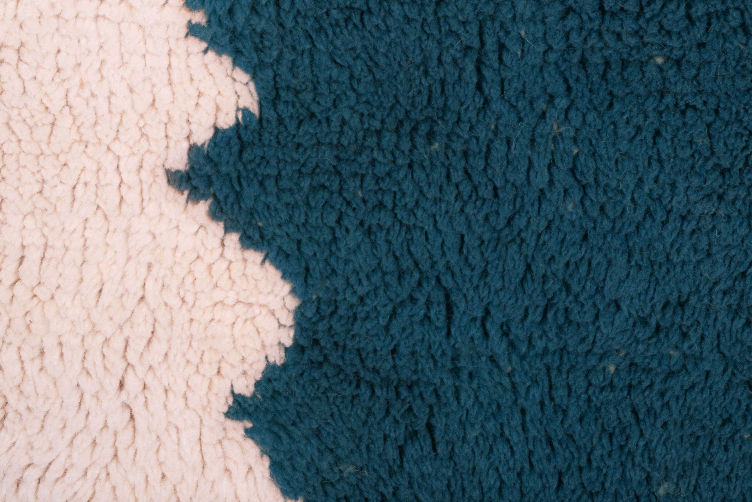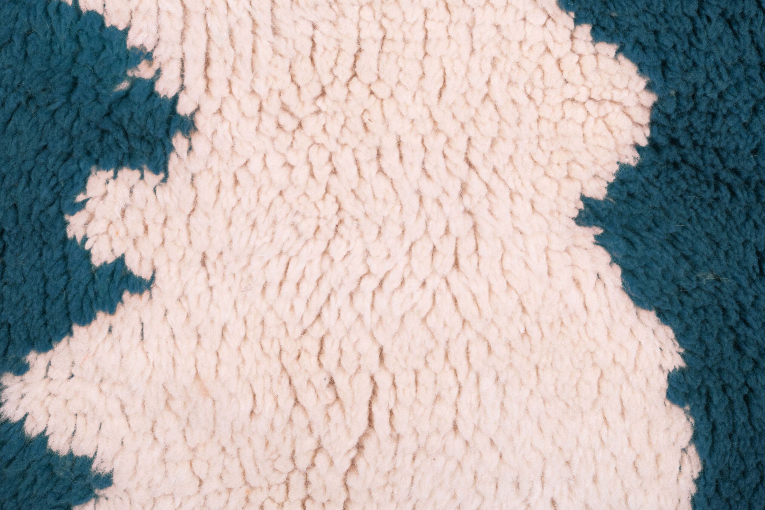 The Blue Azure and White Modern Moroccan Rug is handcrafted to order, requiring 3 to 5 weeks for production. Larger or more intricate designs may take additional time.