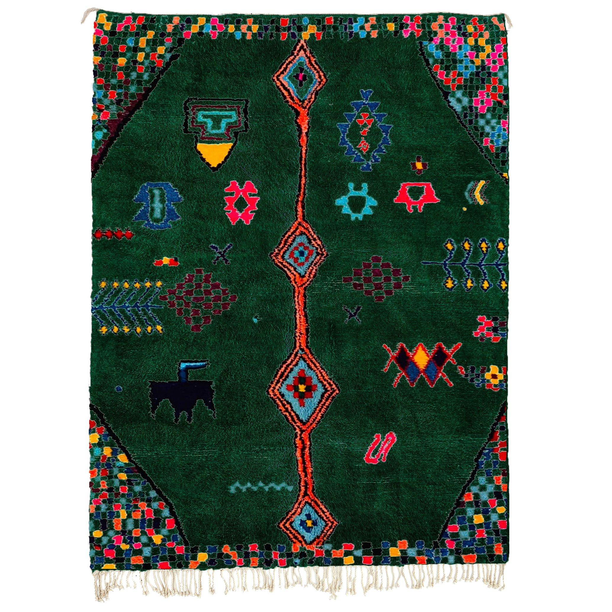 - Unique Design: Featuring a lush green backdrop adorned with colorful geometric patterns, this rug brings life and energy to your space. Its bold, intricate design adds depth and character while reflecting the rich artistry of Moroccan traditions.