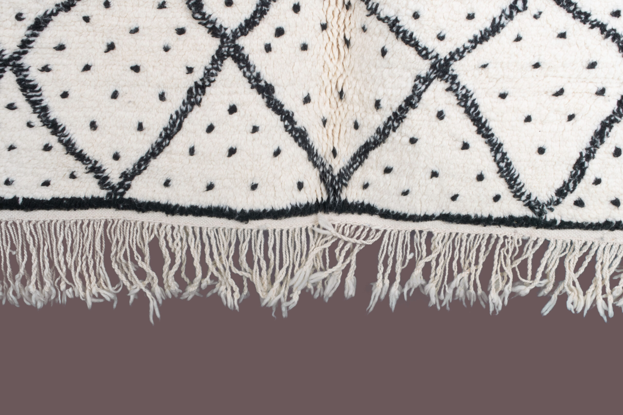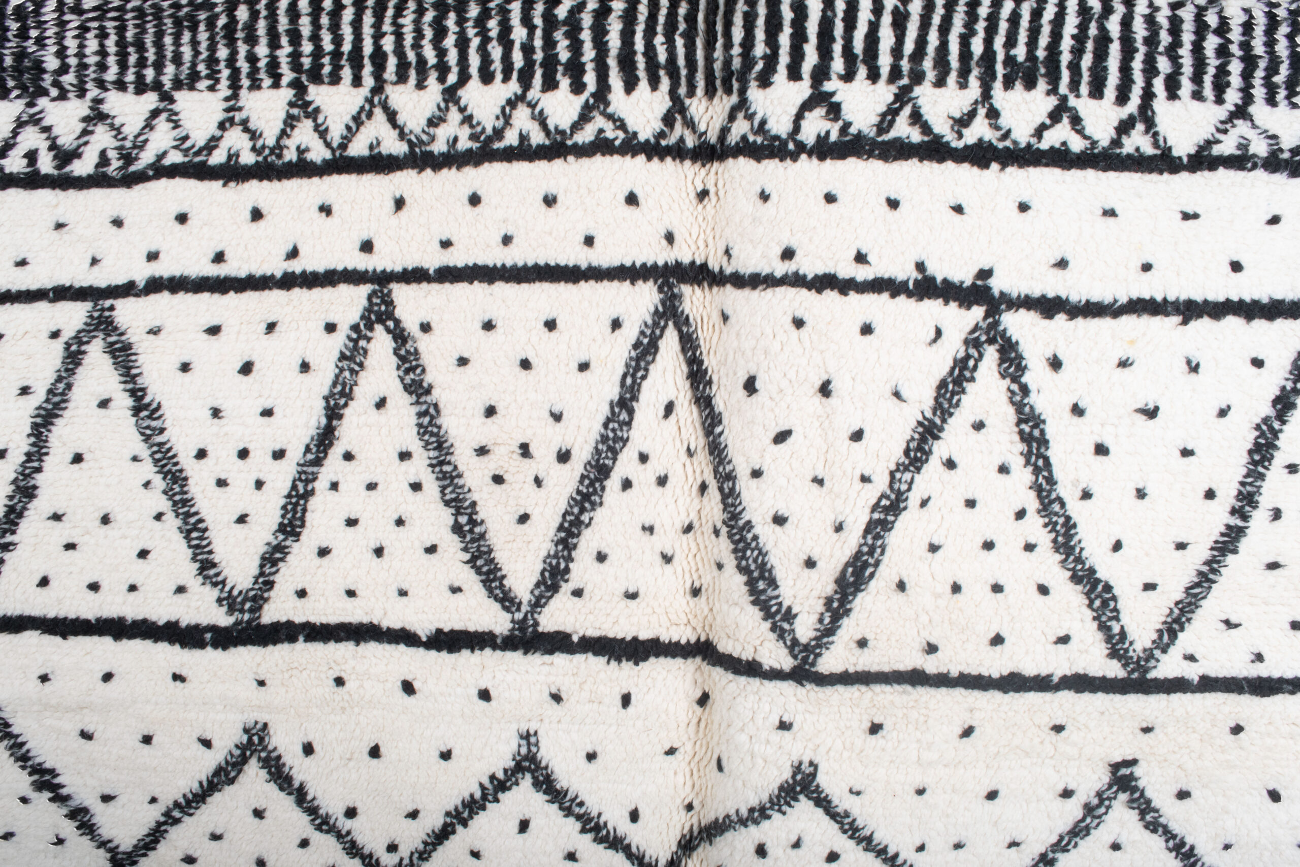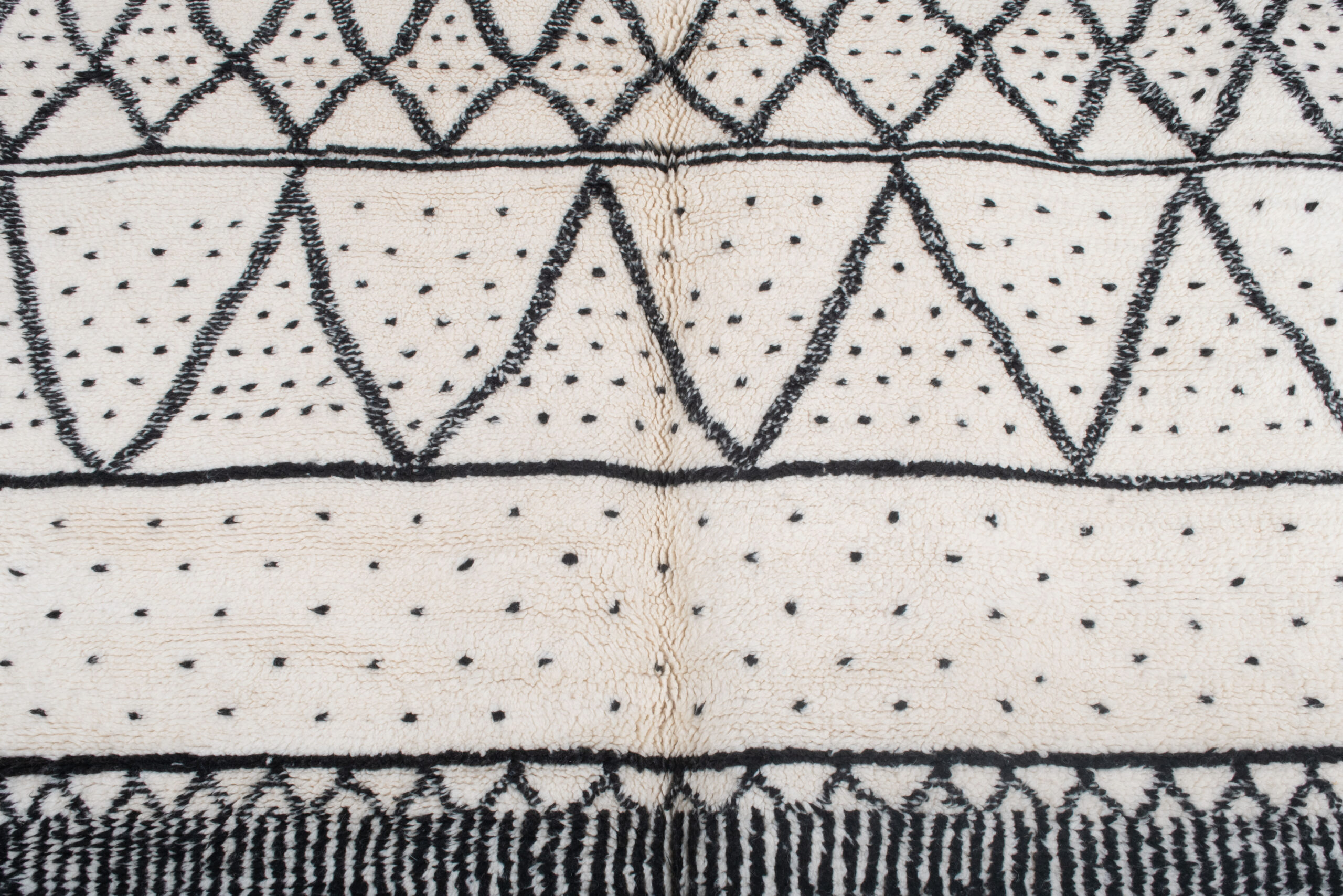 Elevate your decor with the unique allure of the Black Lines Beni Ourain Rug. Measuring 9.6 ft x 6.4 ft (292 cm x 195 cm), this rug showcases a fusion of contemporary lines and traditional Berber craftsmanship. The striking black lines against the natural cream background create a captivating contrast that’s perfect for modern interiors.