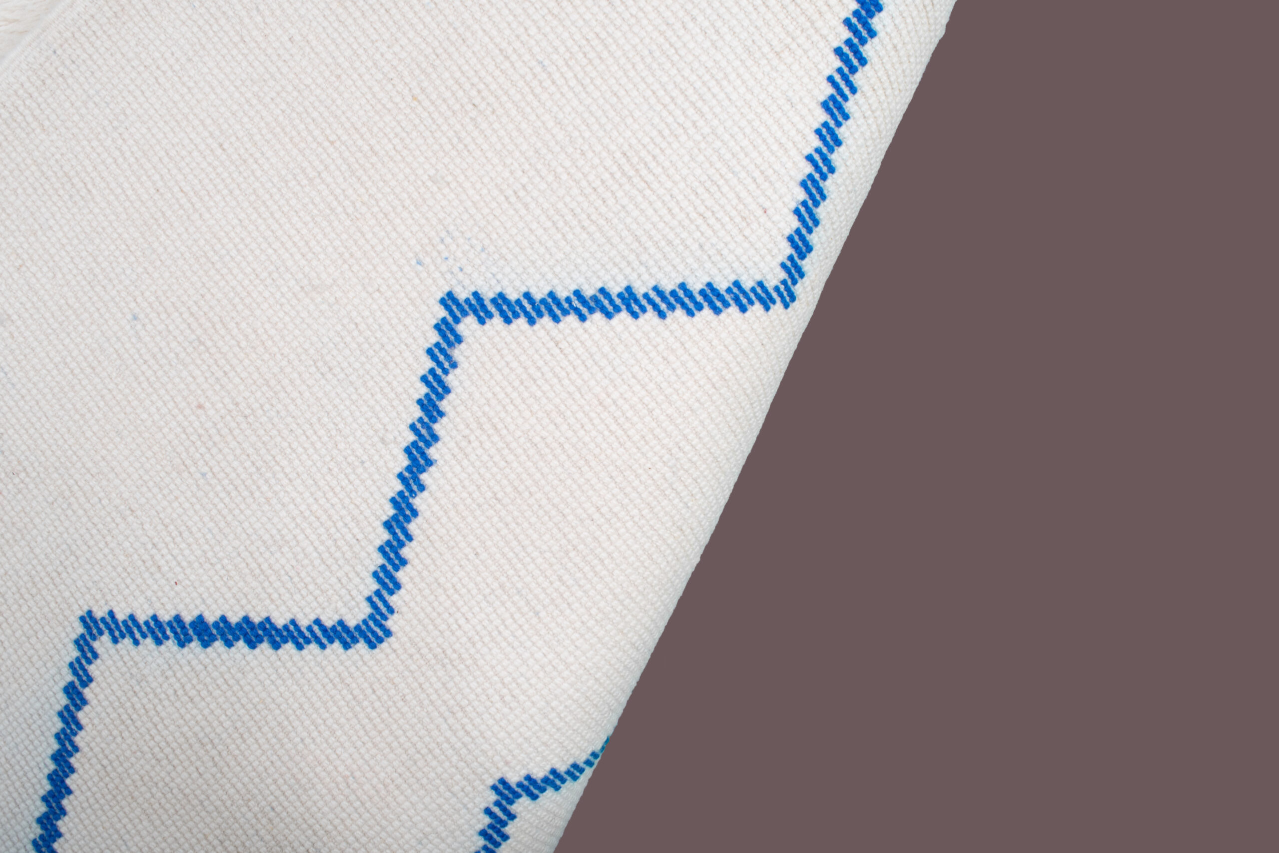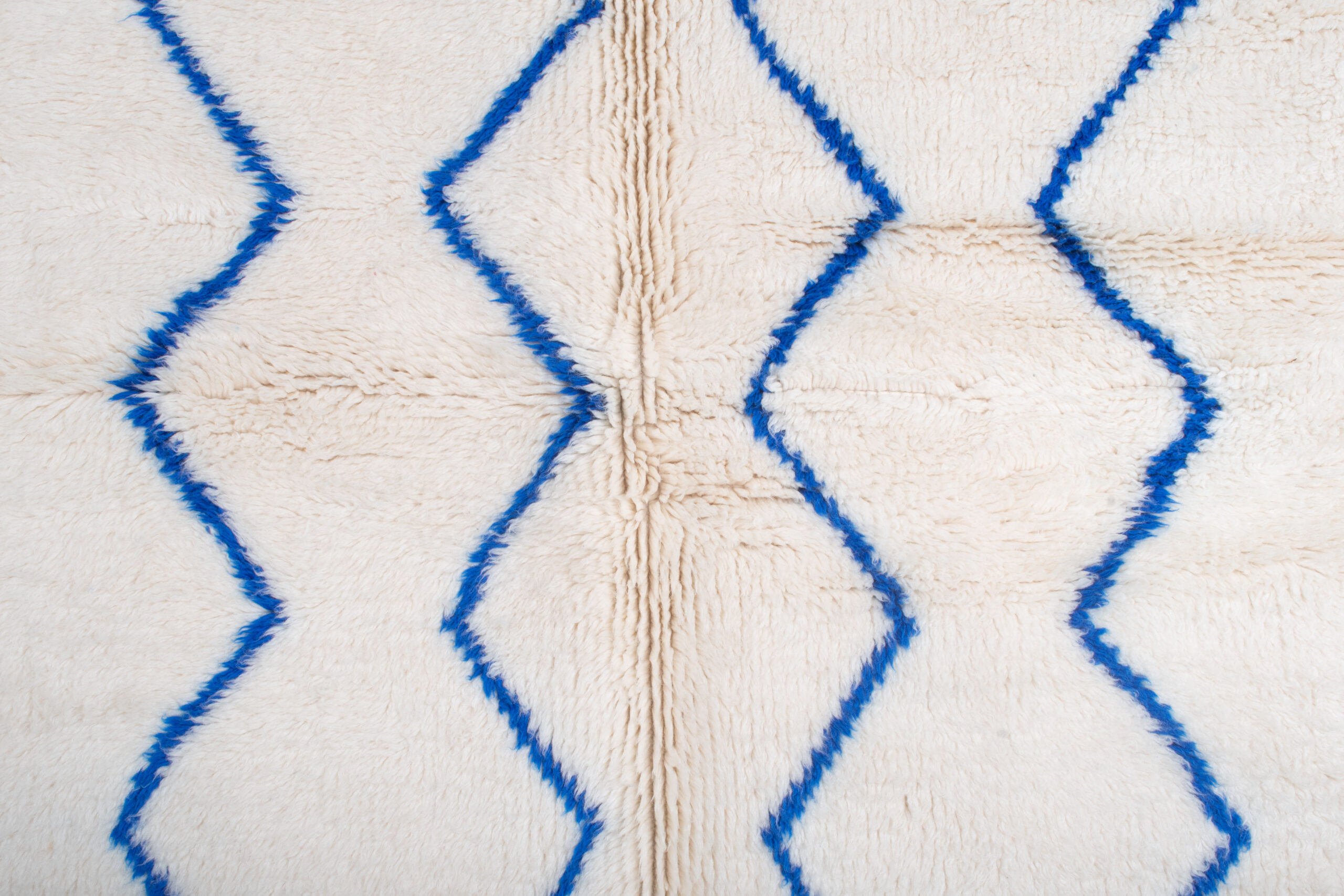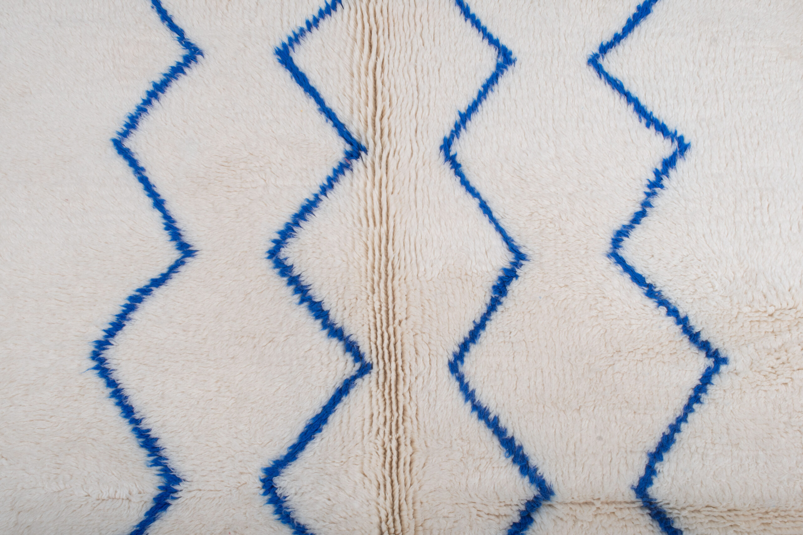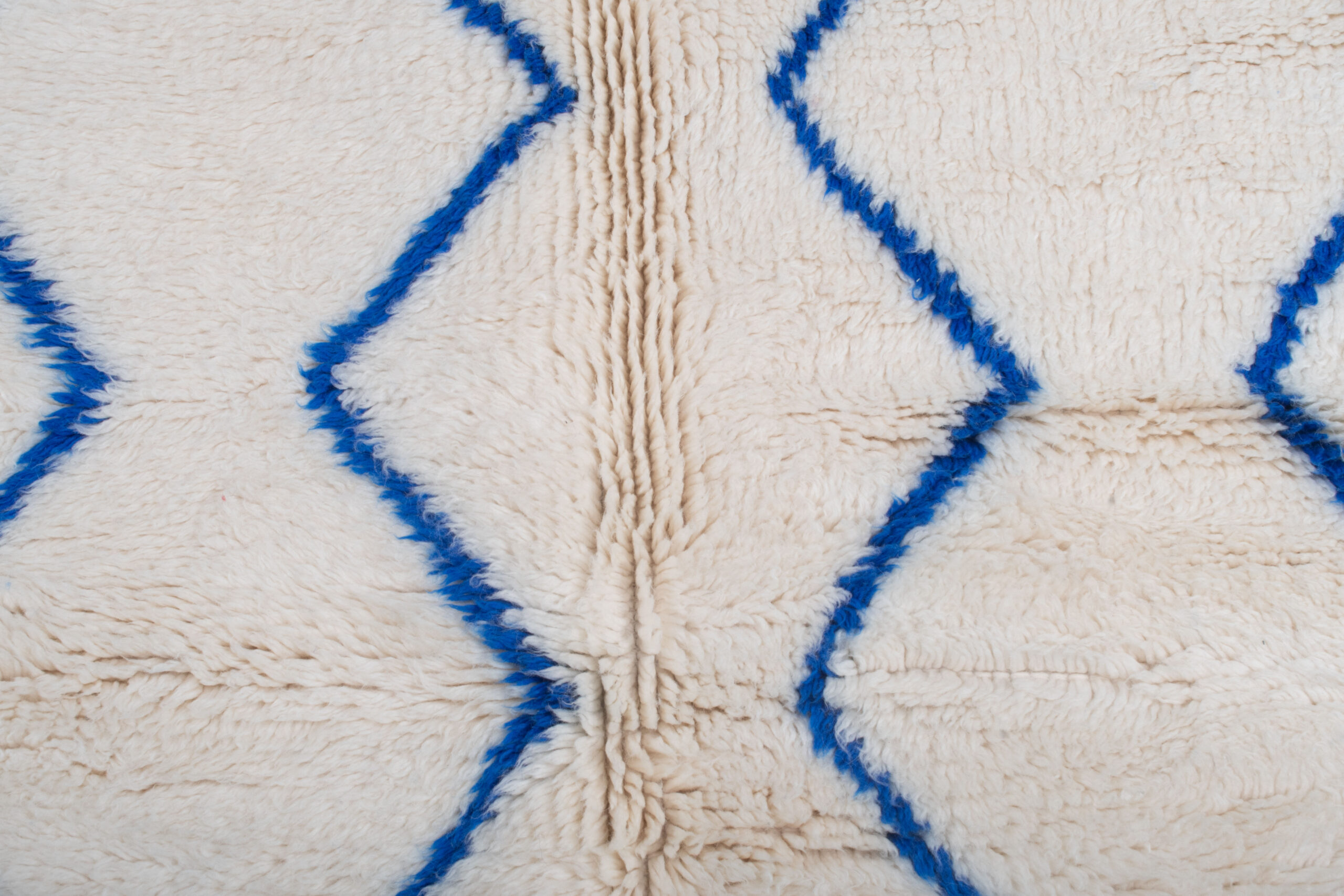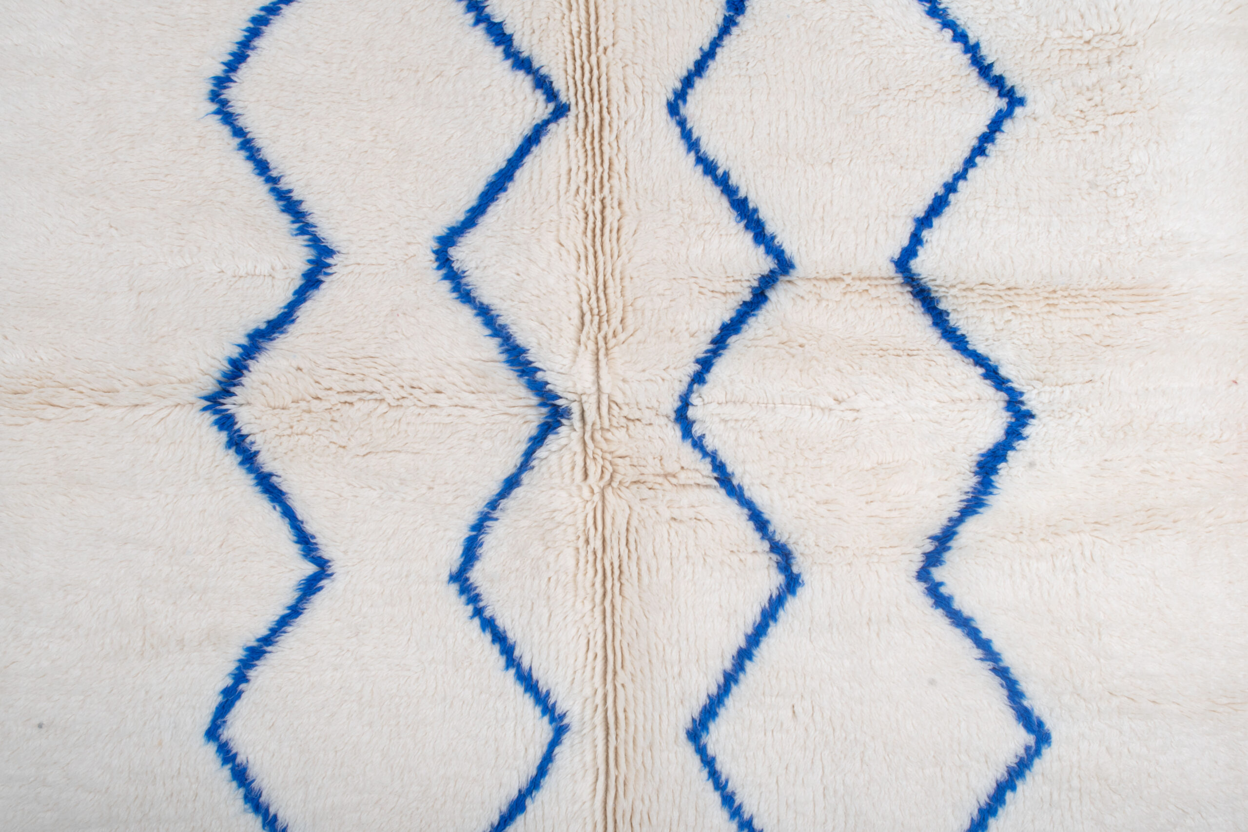 Indulge in the enchanting charm of Moroccan design with our Blue Lines Beni Ourain Rug. Skillfully handcrafted from premium wool, this 7.6 ft x 5.5 ft (231.1 cm x 167.6 cm) rug showcases an intricate geometric pattern adorned with soothing blue lines against a backdrop of white.