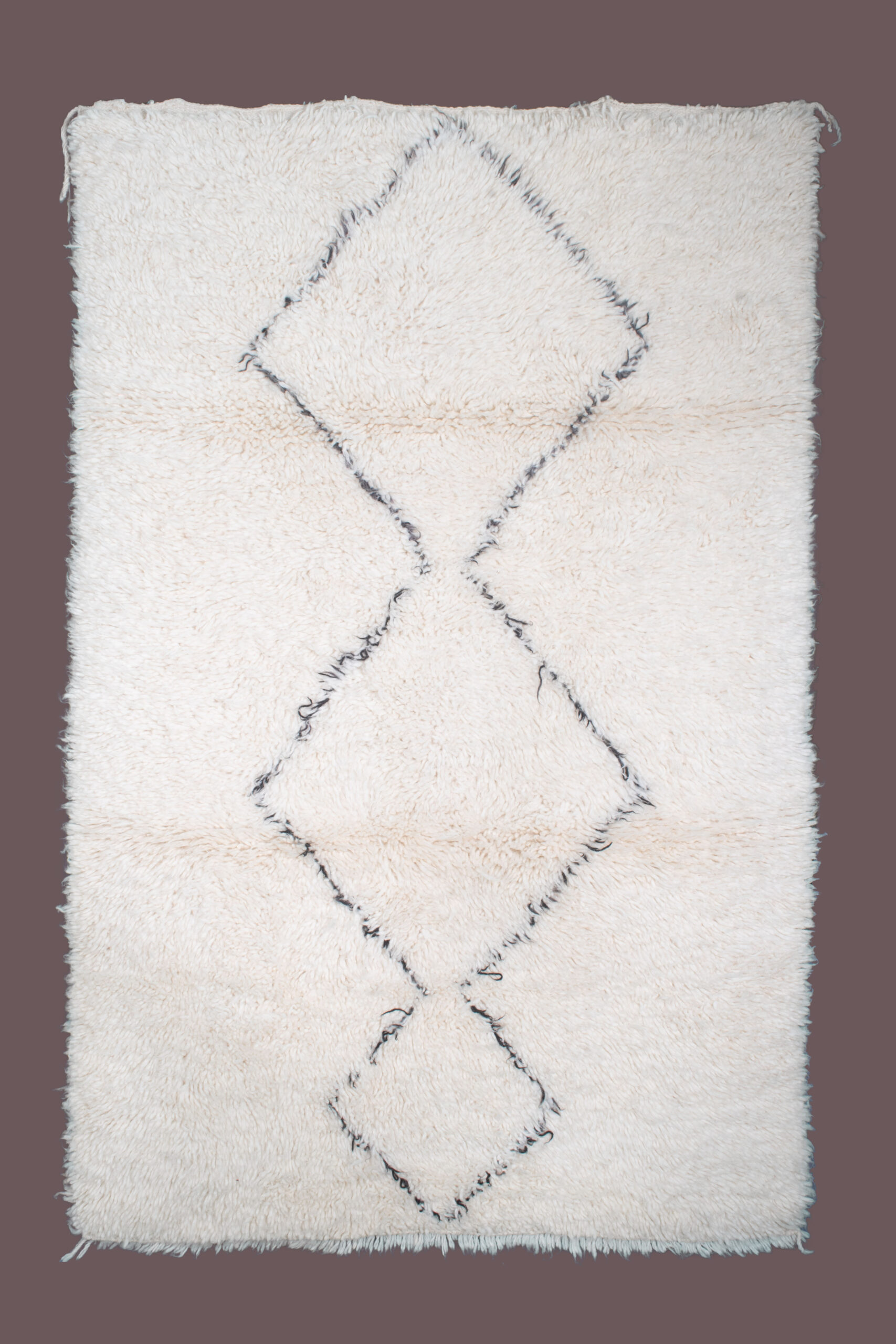 Experience the allure of Moroccan culture with our White Beni Ourain Rug. This exquisite handwoven wool rug, sized at 6.5 ft x 4.2 ft (198 cm x 128 cm), is a testament to the craftsmanship and creativity of Berber artisans in Morocco.