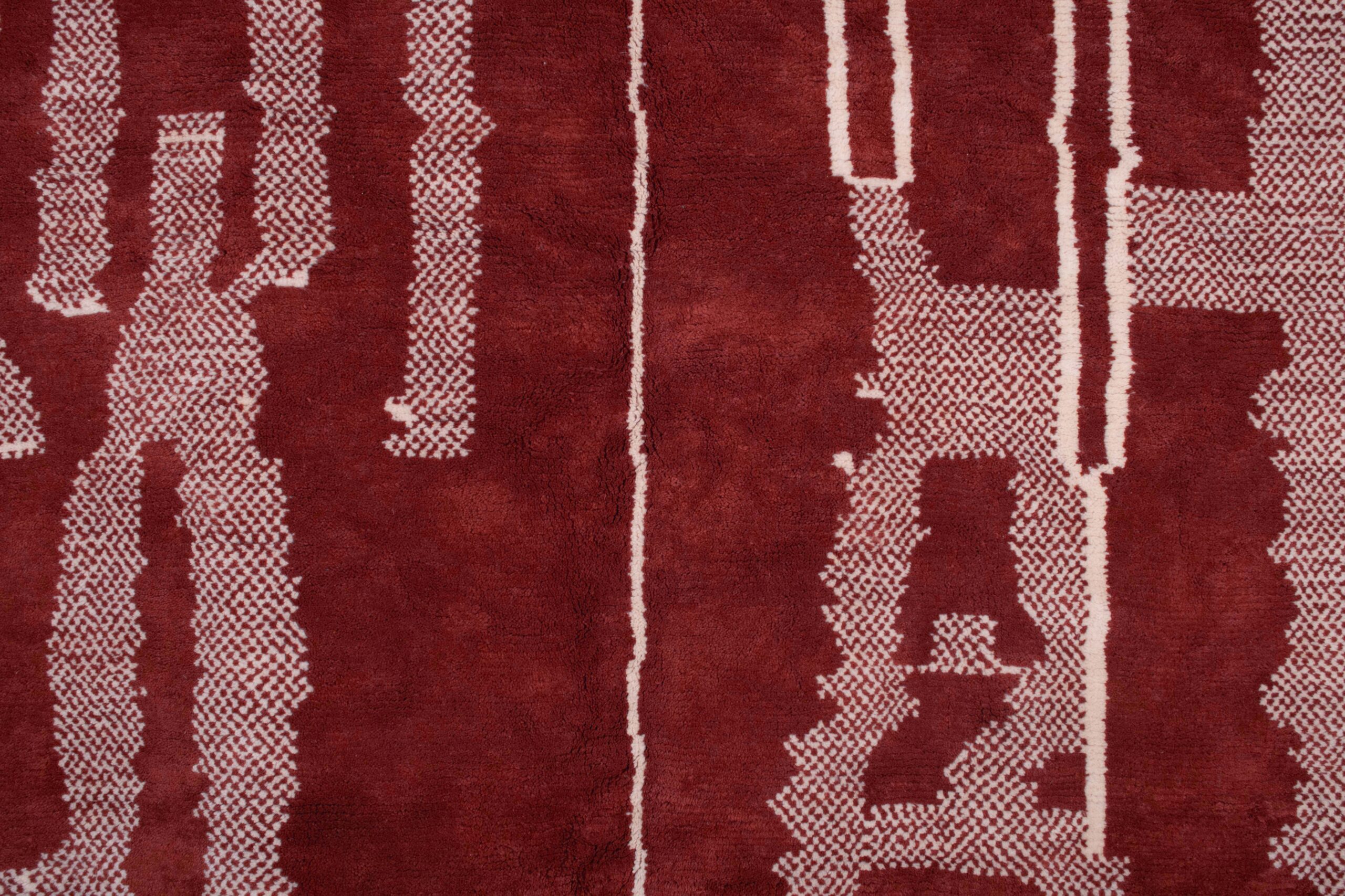The Dark Red and White Symbolic Modern Moroccan Rug is made to order, requiring 3 to 5 weeks for production. Larger or more intricate designs may take additional time.