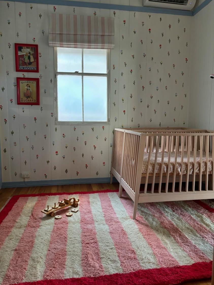 a baby ' s room with a cribe and a cribe. WhatsApp Image 2024-12-09 at 19.16.05Exclusive Geebungalow Red White Pink Moroccan Rug Stripes Geometric Pattern
