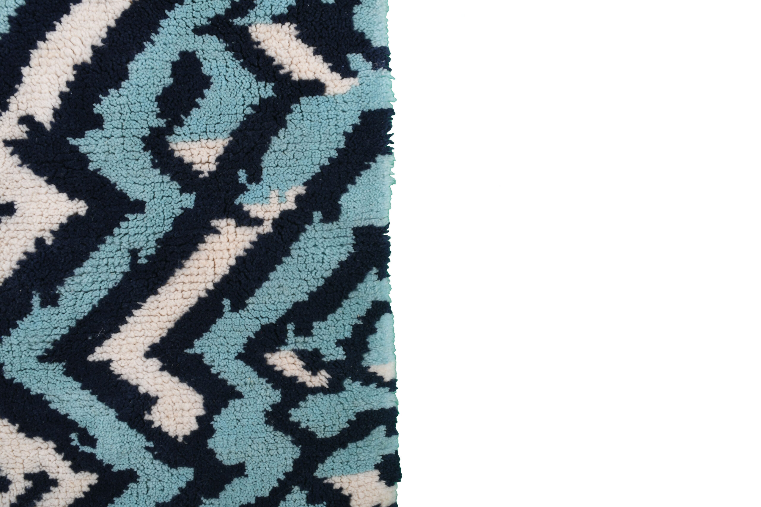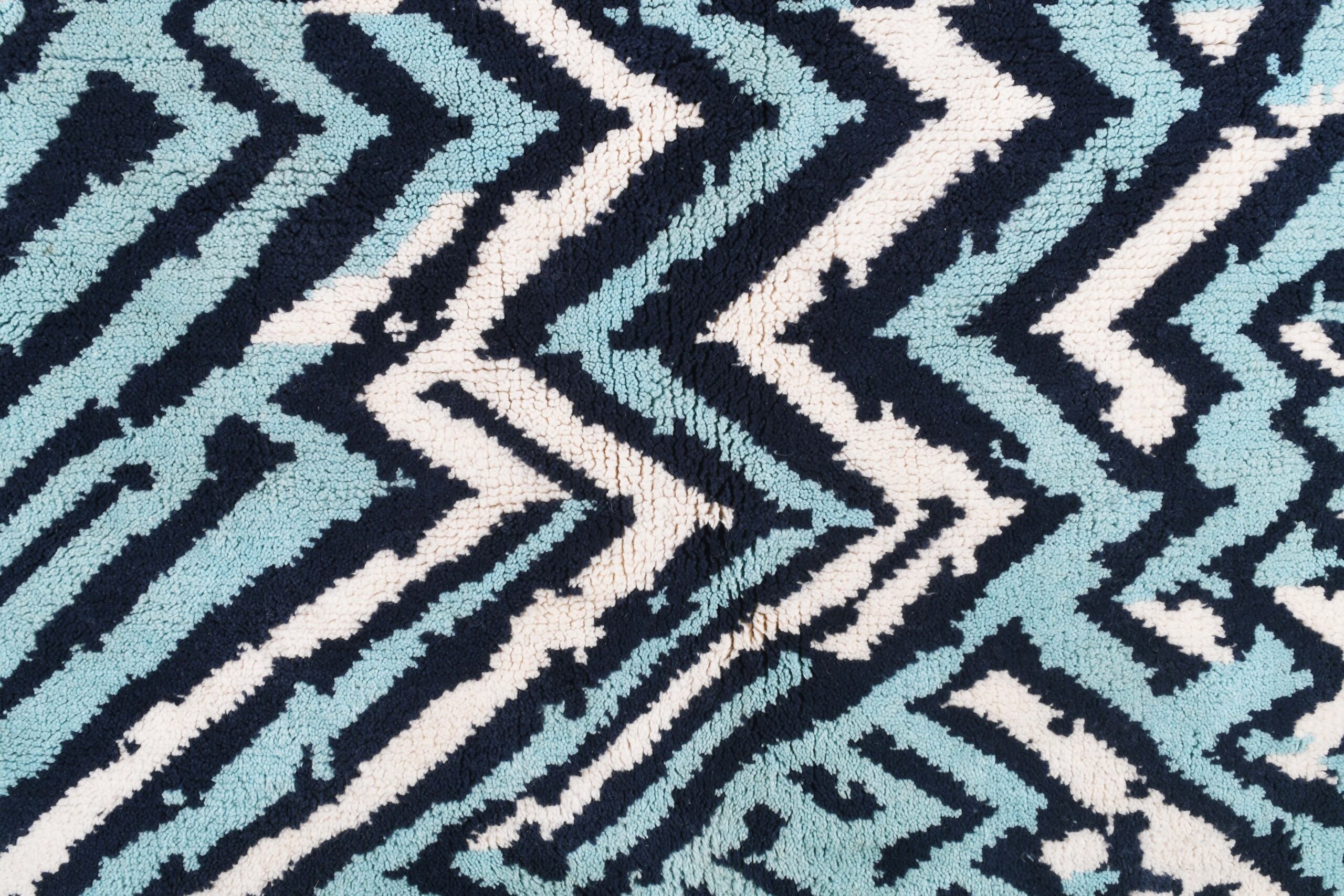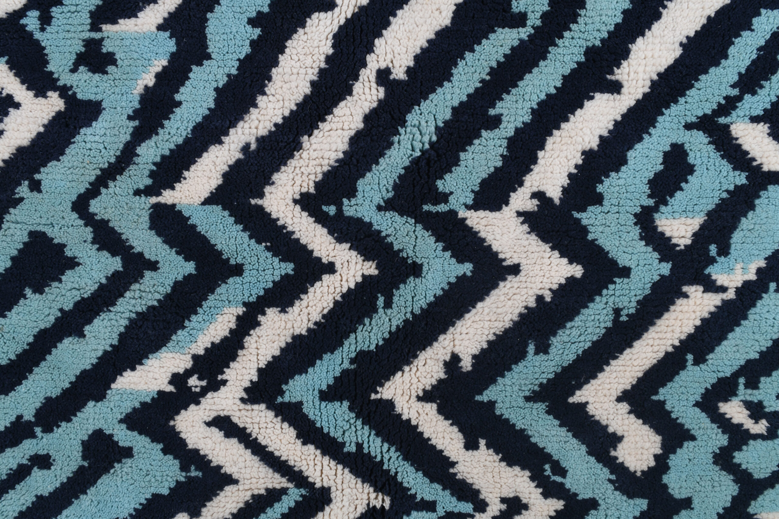The Exclusive White & Blue Moroccan Rug Zigzag Abstract Pattern is custom-made, taking approximately 3 to 5 weeks. Larger or more intricate designs may require additional time.