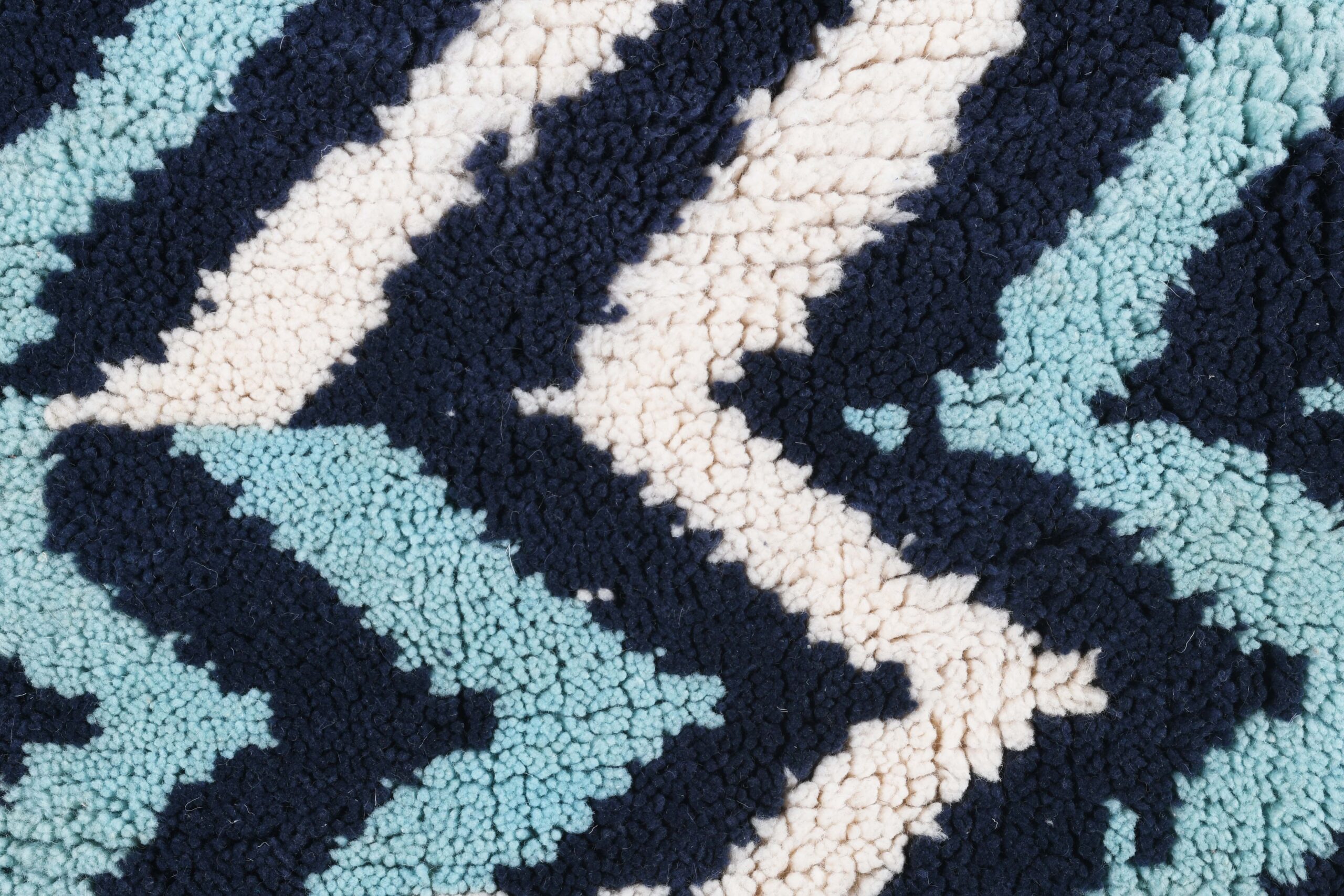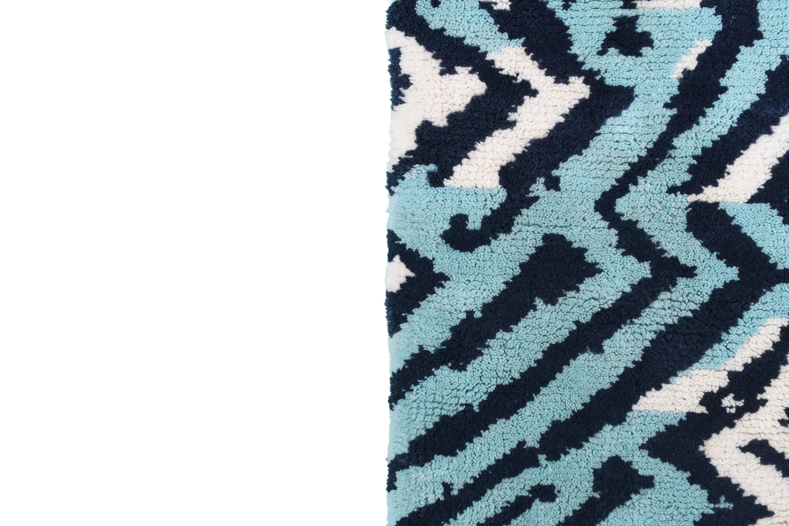 Elevate your home with the Exclusive White & Blue Moroccan Rug Zigzag Abstract Pattern. The abstract zigzag design in vibrant blue creates a dynamic focal point, perfectly complementing contemporary, bohemian, or eclectic interiors.