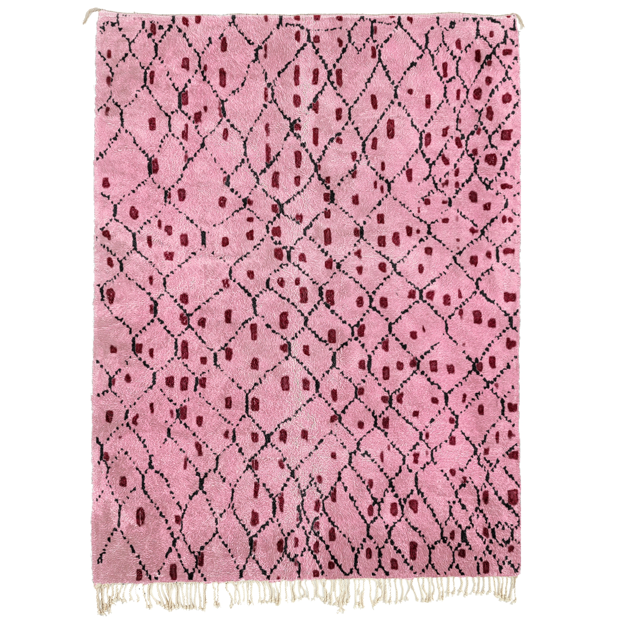 Enhance your interior with the Pink and Black Moroccan Rug with Lozenges Pattern, a beautiful blend of vibrant hues and timeless geometric patterns. Its soft pink base is complemented by intricate black lozenges, symbolizing unity and protection.