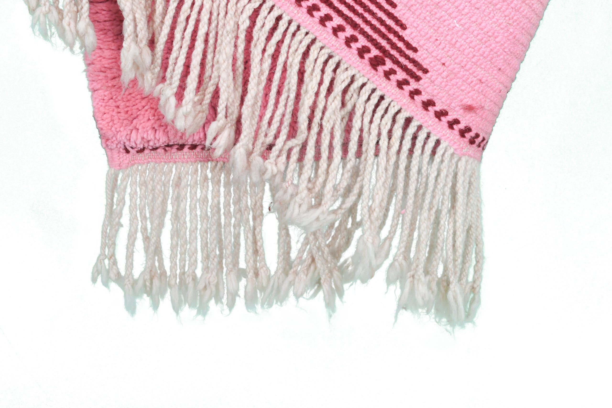 This rug is meticulously crafted using time-honored Moroccan weaving techniques, combining aesthetic appeal with lasting quality. Its warm tones of pink and dark red create a cozy ambiance, making it ideal for bedrooms, living rooms, or study areas.