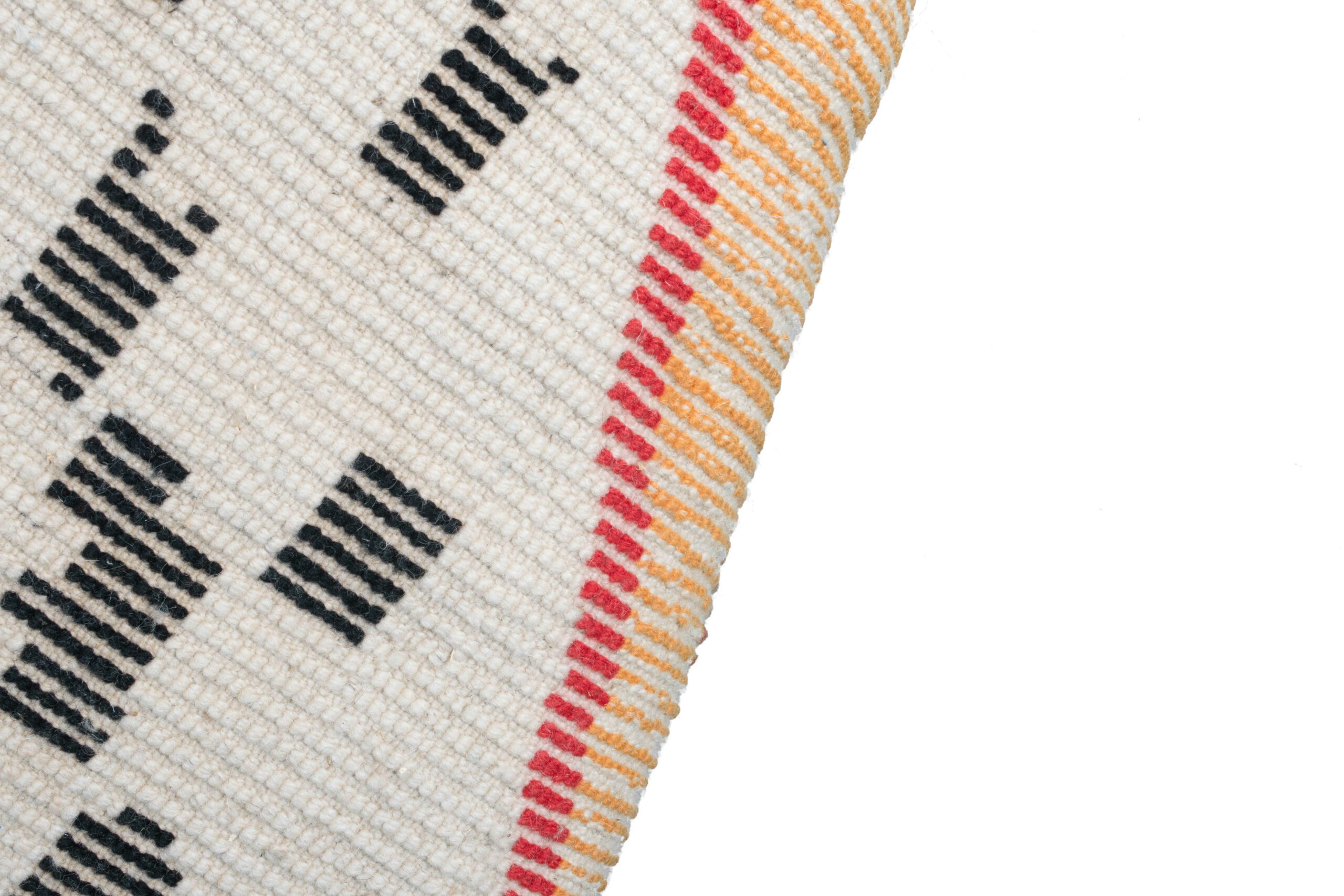 a white rug with a colorful design. VINA064-W-40_BK-39_BL-09_RD-18 (1.1)White Moroccan Rug Multicolor Bohemian Style Rug
