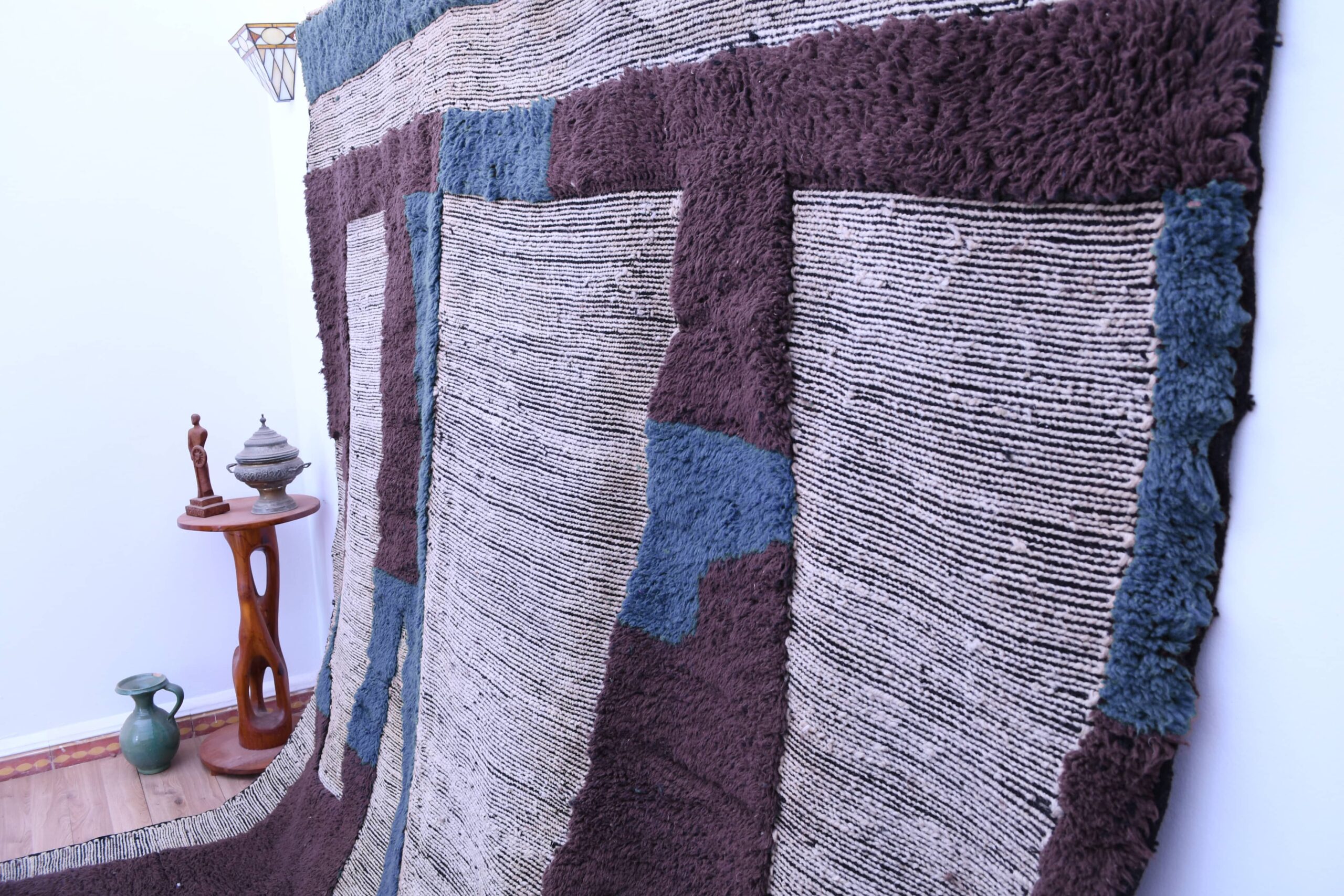 Authentic Moroccan Mrirt Wool Rug 200x300cm - Geometric Pattern in White, Brown, BlueAuthentic Moroccan Mrirt Wool Rug 200x300cm – Geometric Pattern in White, Brown, Blue
