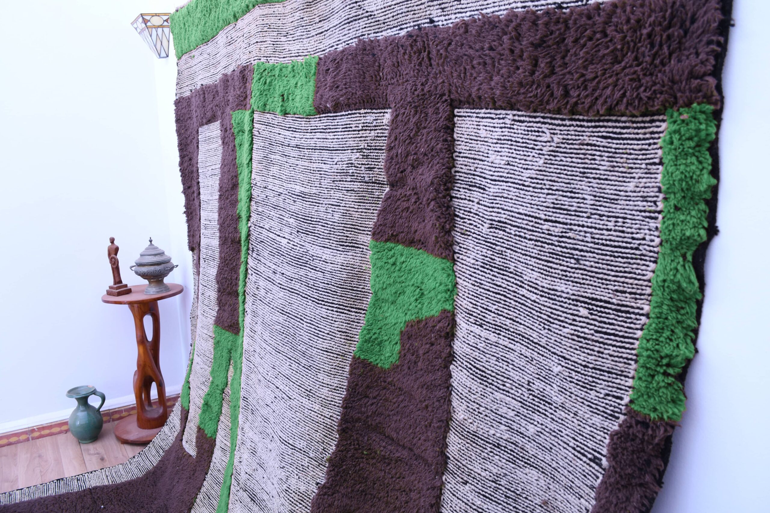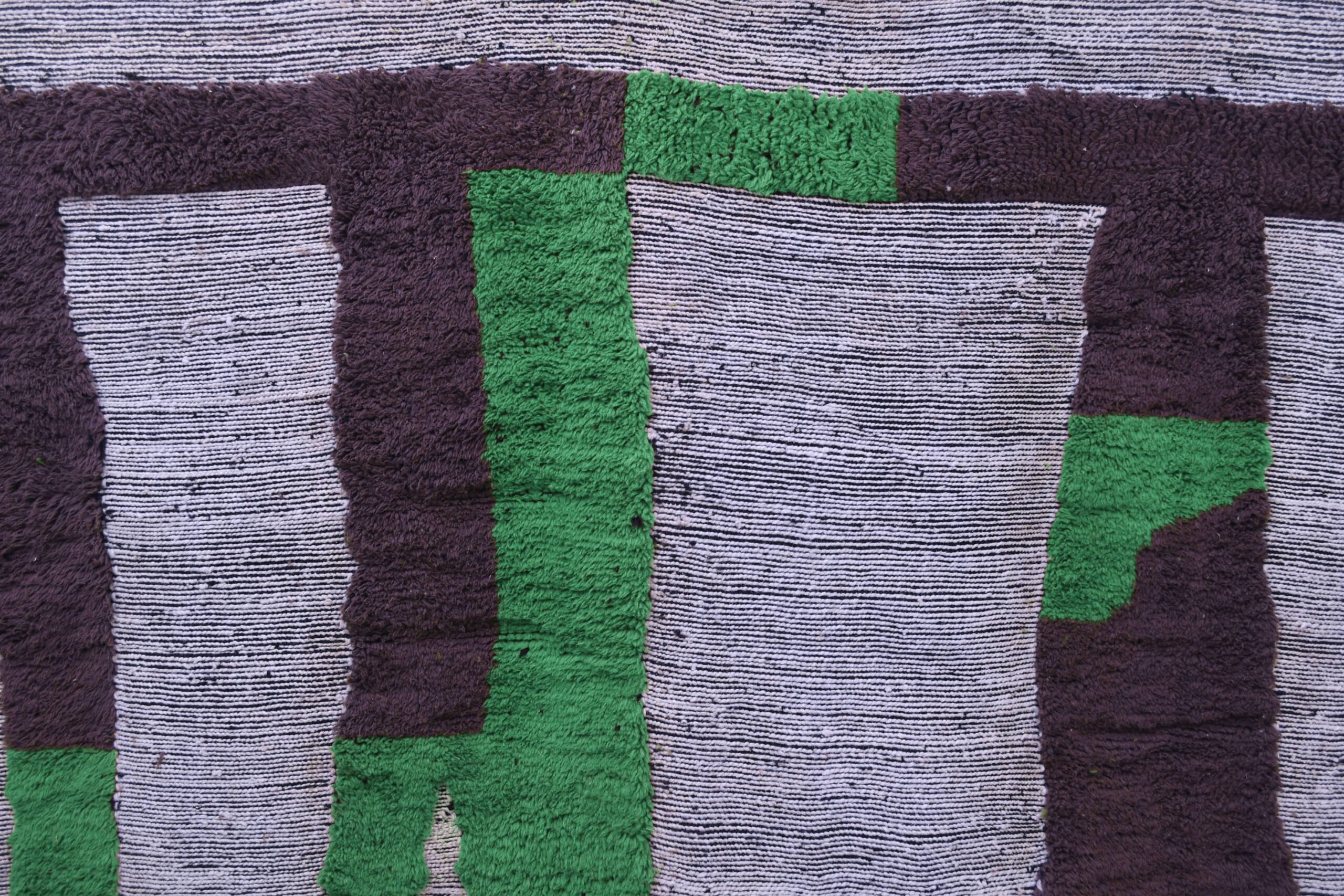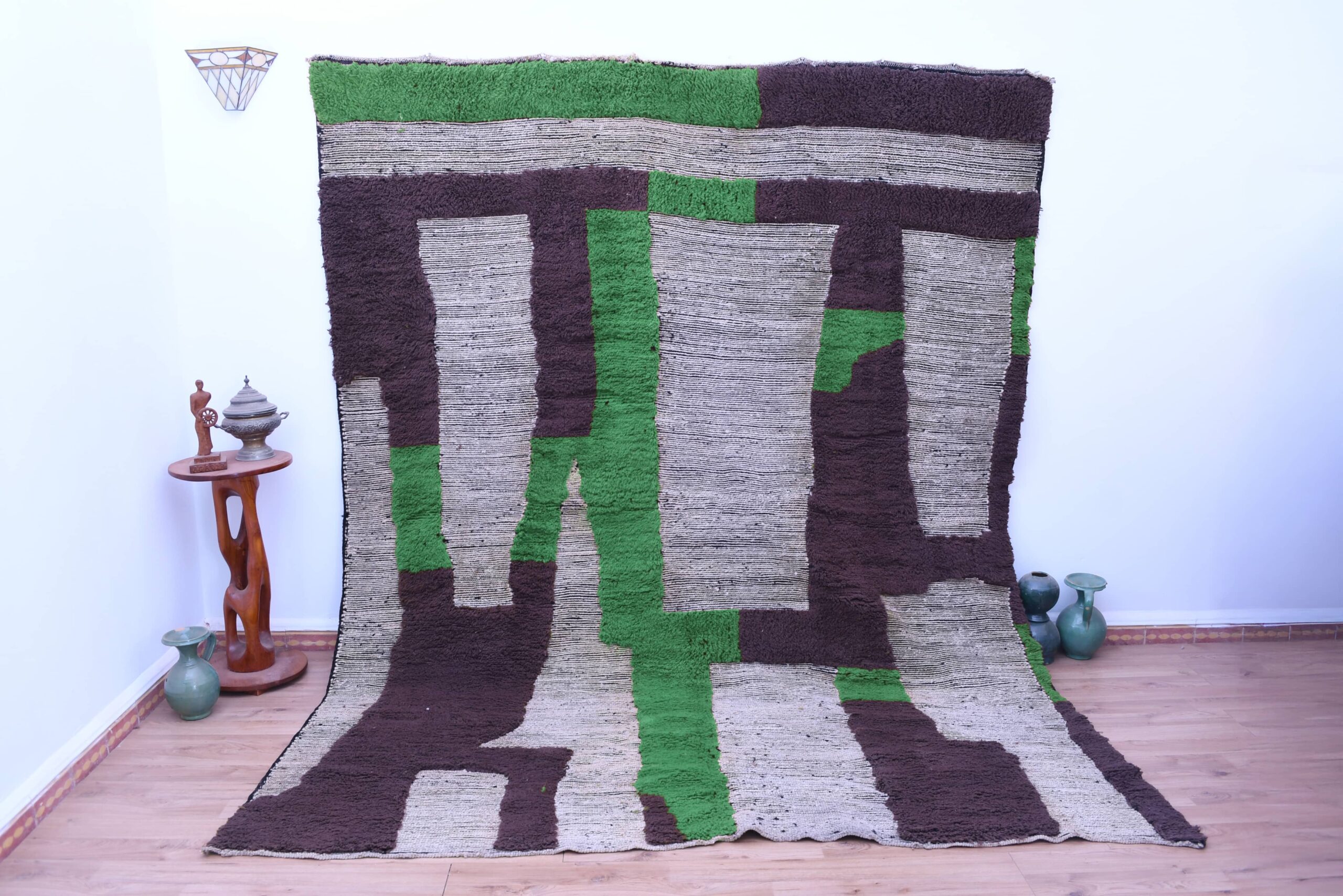 This stunning Mrirt rug showcases a contemporary geometric design that embodies the rich heritage of Moroccan artistry. The rug features bold, abstract motifs that create a dynamic visual appeal, making it a perfect centerpiece for any room. The intricate patterns are meticulously crafted, reflecting the traditional skills of Moroccan artisans.