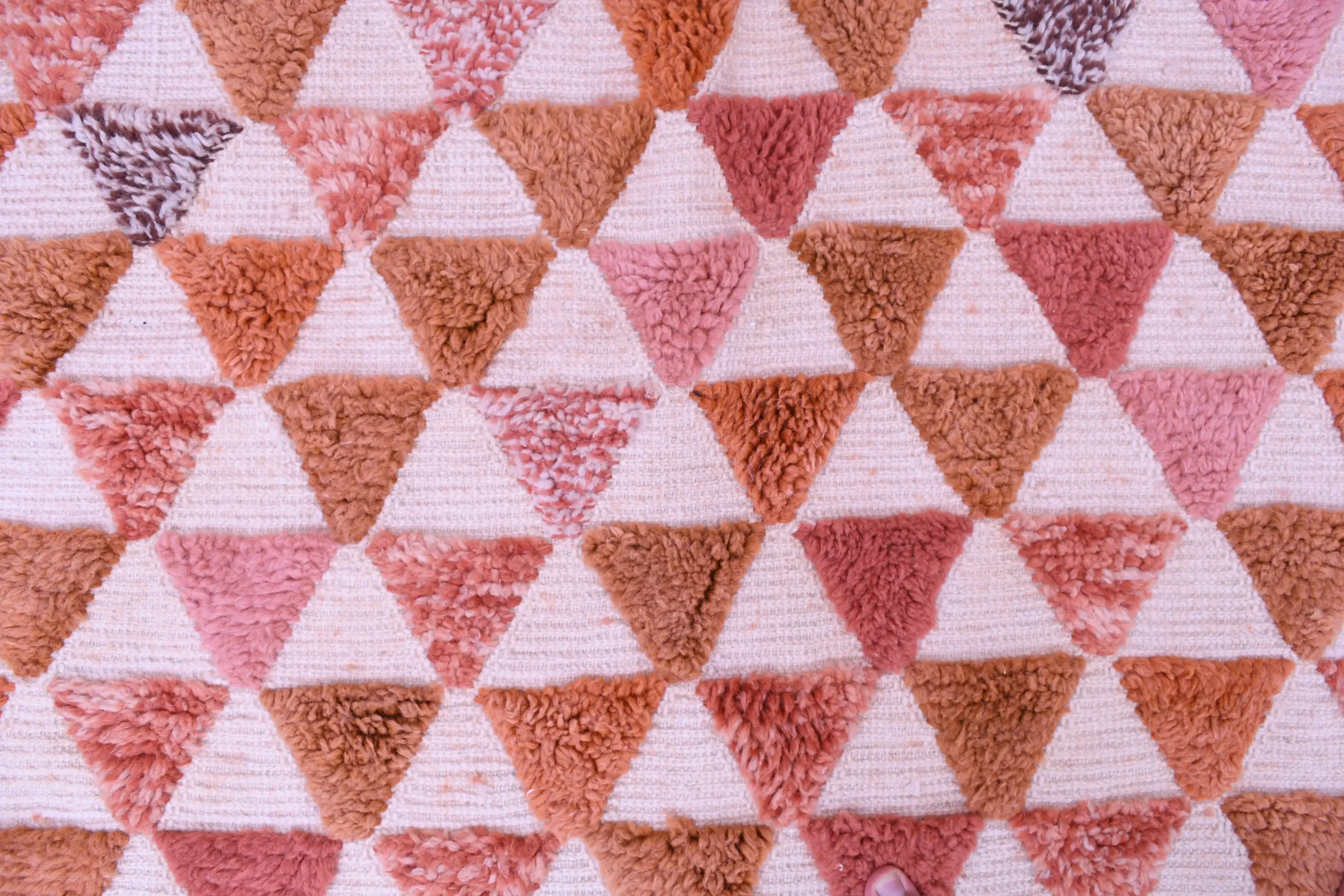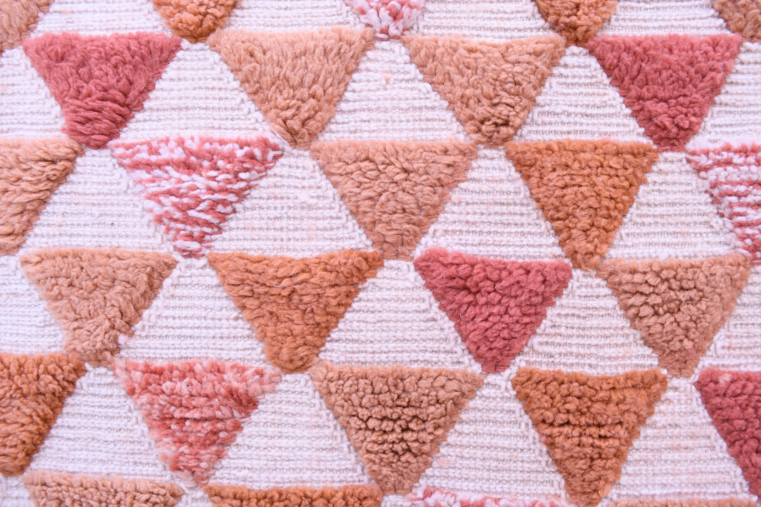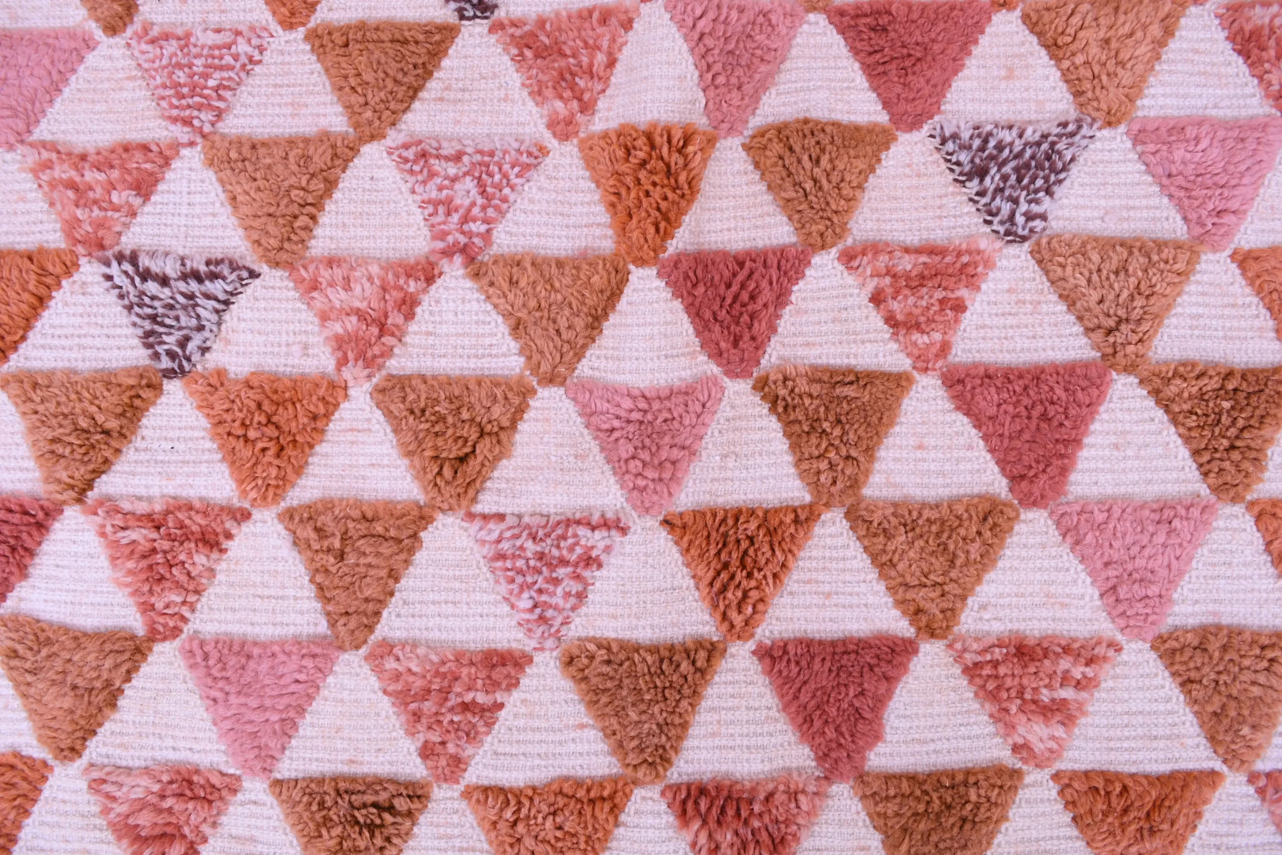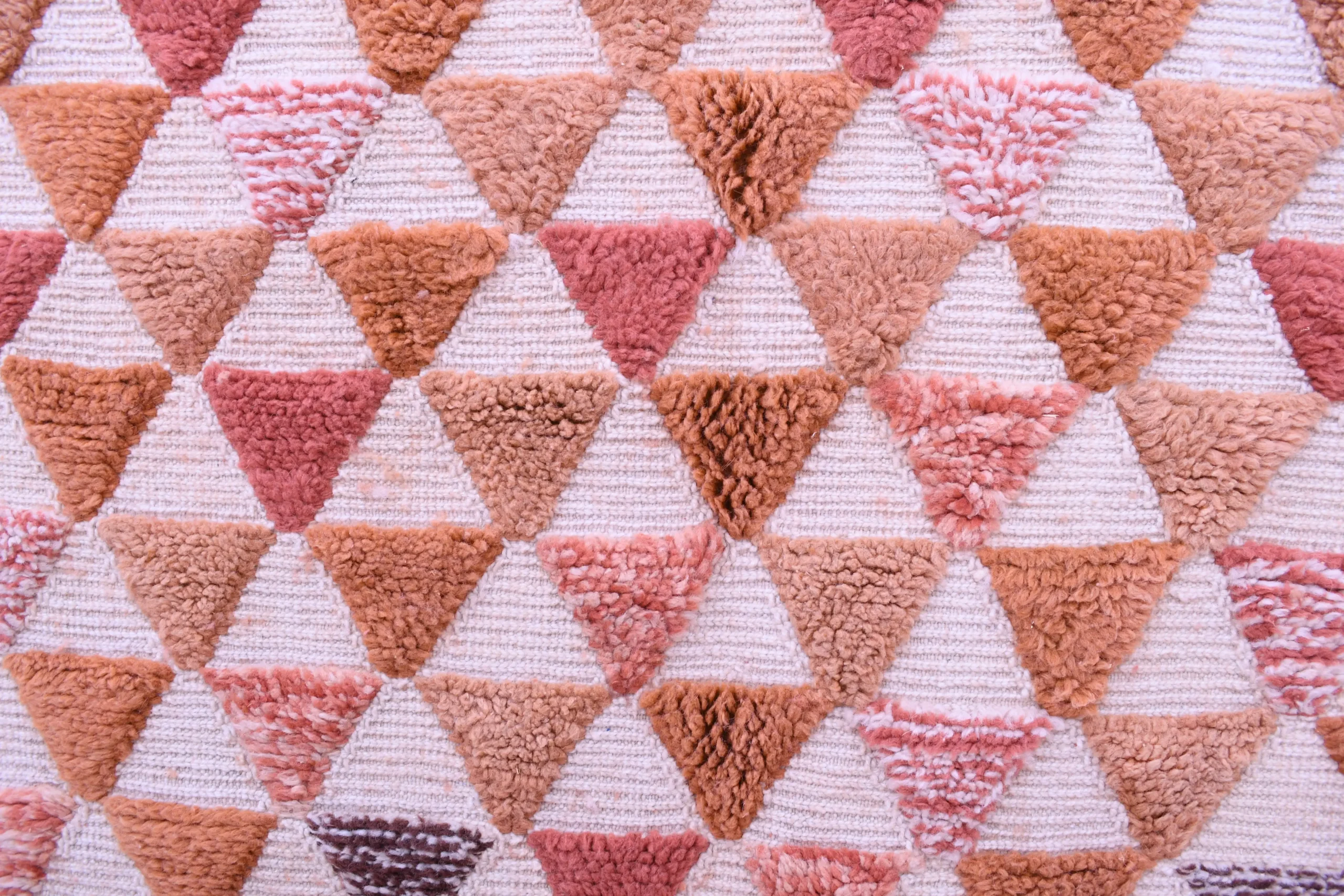 This stunning Mrirt rug, measuring 205.00 × 291.00 cm, showcases a captivating geometric pattern of interlocking triangles. The design is both traditional and contemporary, making it a versatile addition to any decor. The intricate arrangement of shapes creates a dynamic visual effect that draws the eye and adds depth to any space.