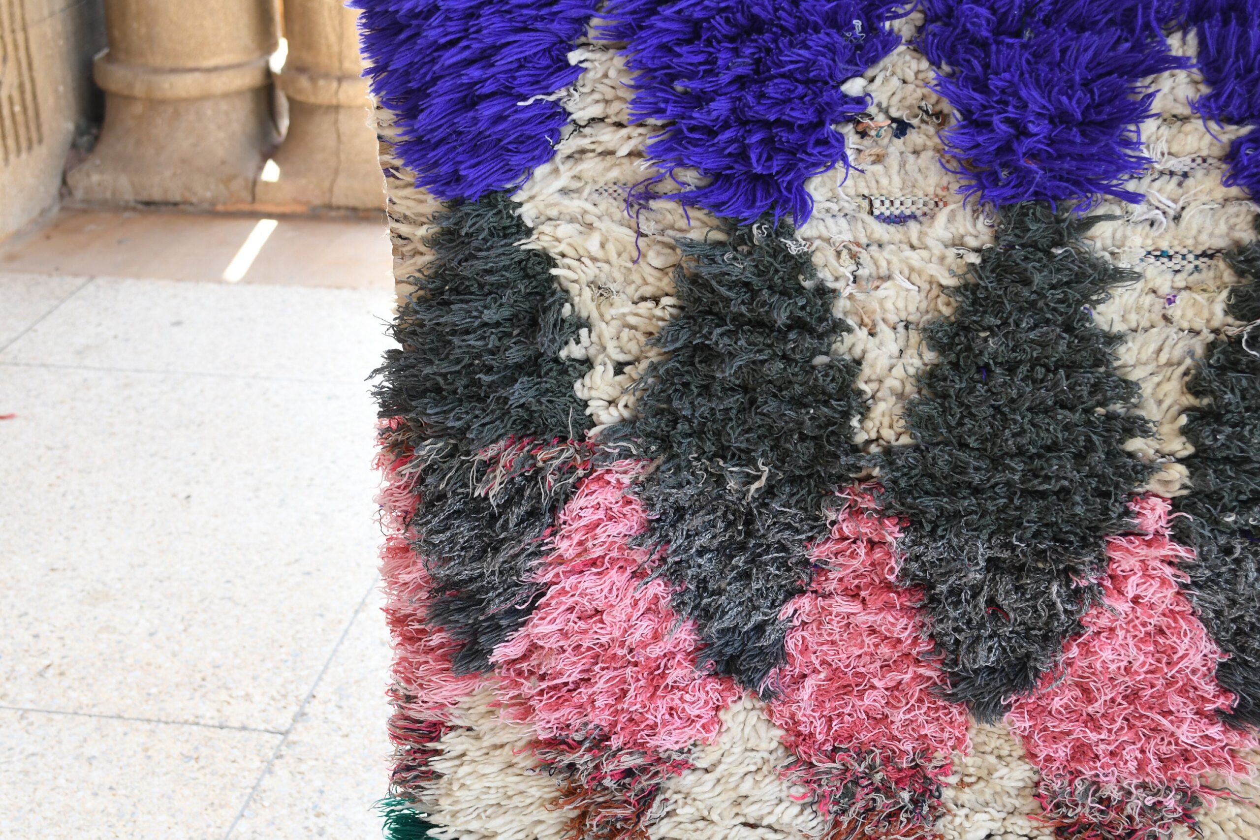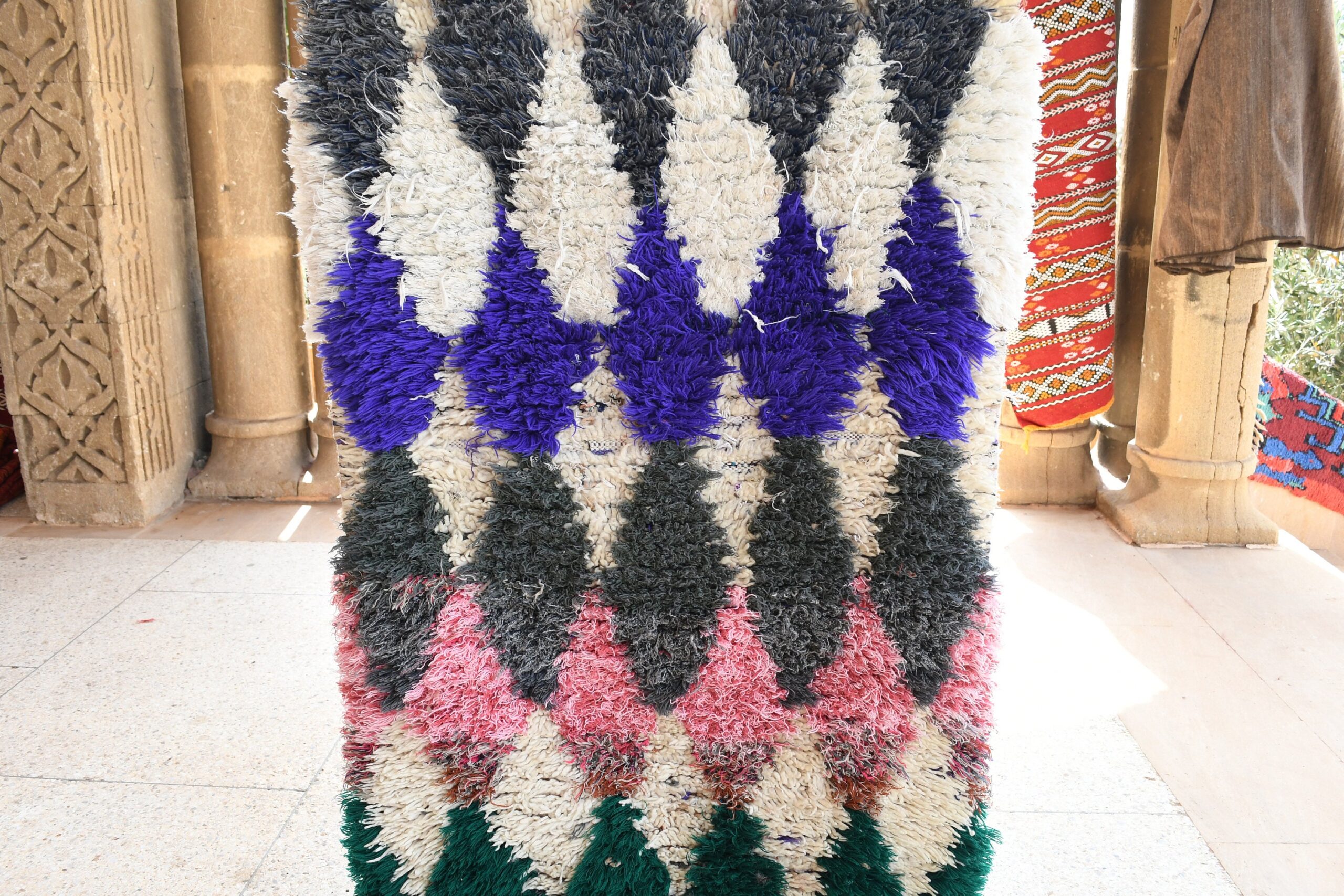Embark on a journey to Morocco with our Boucherouite rug. Each rug is a unique masterpiece, handwoven by skilled artisans using vibrant scraps of fabric. The result is a captivating tapestry of colors and textures that will instantly transform your space. Crafted from the finest materials, Boucherouite rugs are known for their durability and resilience. Use it as a statement piece in your living room, a cozy accent in your bedroom, or a touch of bohemian flair in your entryway. Its versatility makes it an ideal choice for any decor style. Invest in a Boucherouite rug today and experience the quality and craftsmanship that sets Moroccan rugs apart.