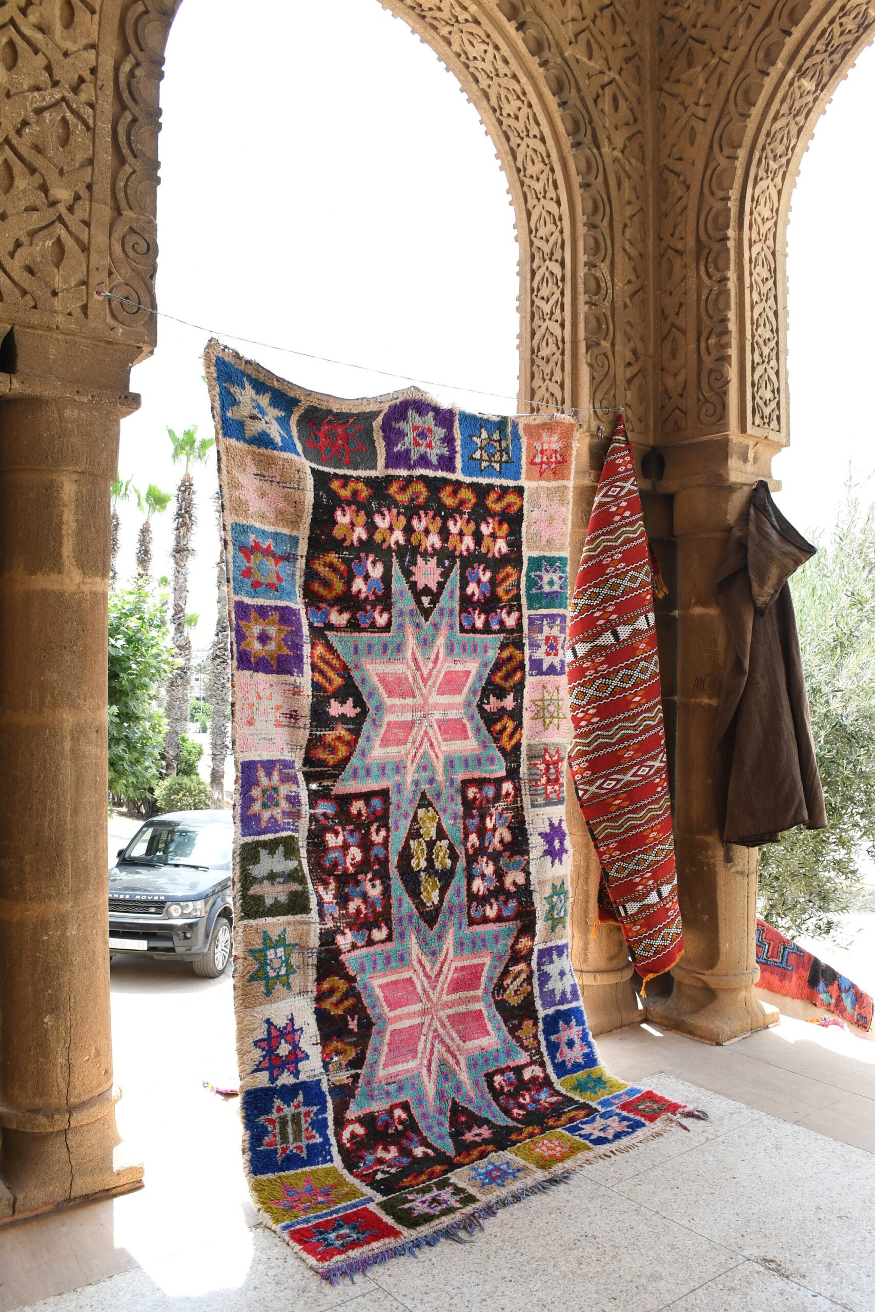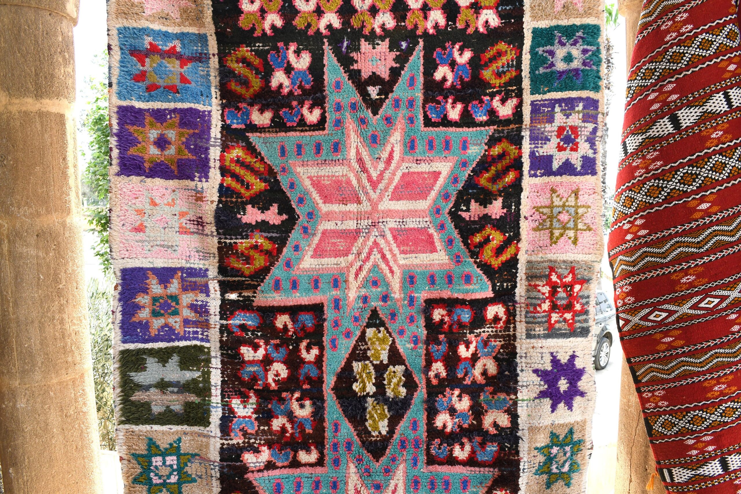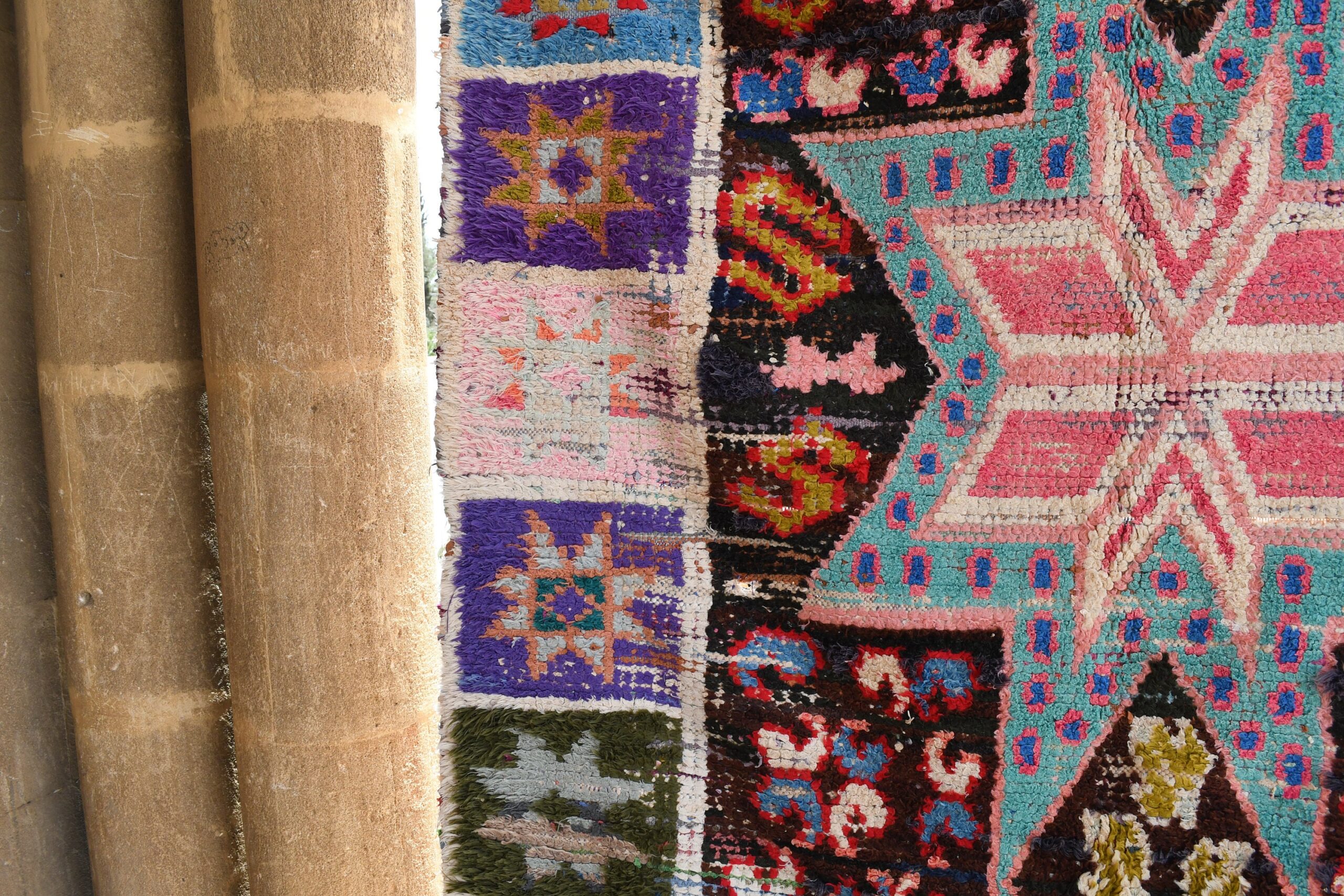 Indulge in the captivating artistry of this Vintage Moroccan rug from WeBerber. Handwoven by skilled artisans using centuries-old techniques, this Boucherouite rug is a testament to the rich cultural heritage of Morocco. Each intricate knot tells a unique story, adding depth and character to its design. Crafted from a blend of soft wool and durable cotton, this rug promises both comfort and longevity. Its vibrant colors and bold geometric patterns will effortlessly transform any room into a bohemian paradise. Whether used as a statement piece in your living room or a cozy accent in your bedroom, this Boucherouite rug is sure to become a cherished heirloom. Embrace the allure of authenticity and immerse yourself in the beauty of Moroccan craftsmanship with this exceptional piece.