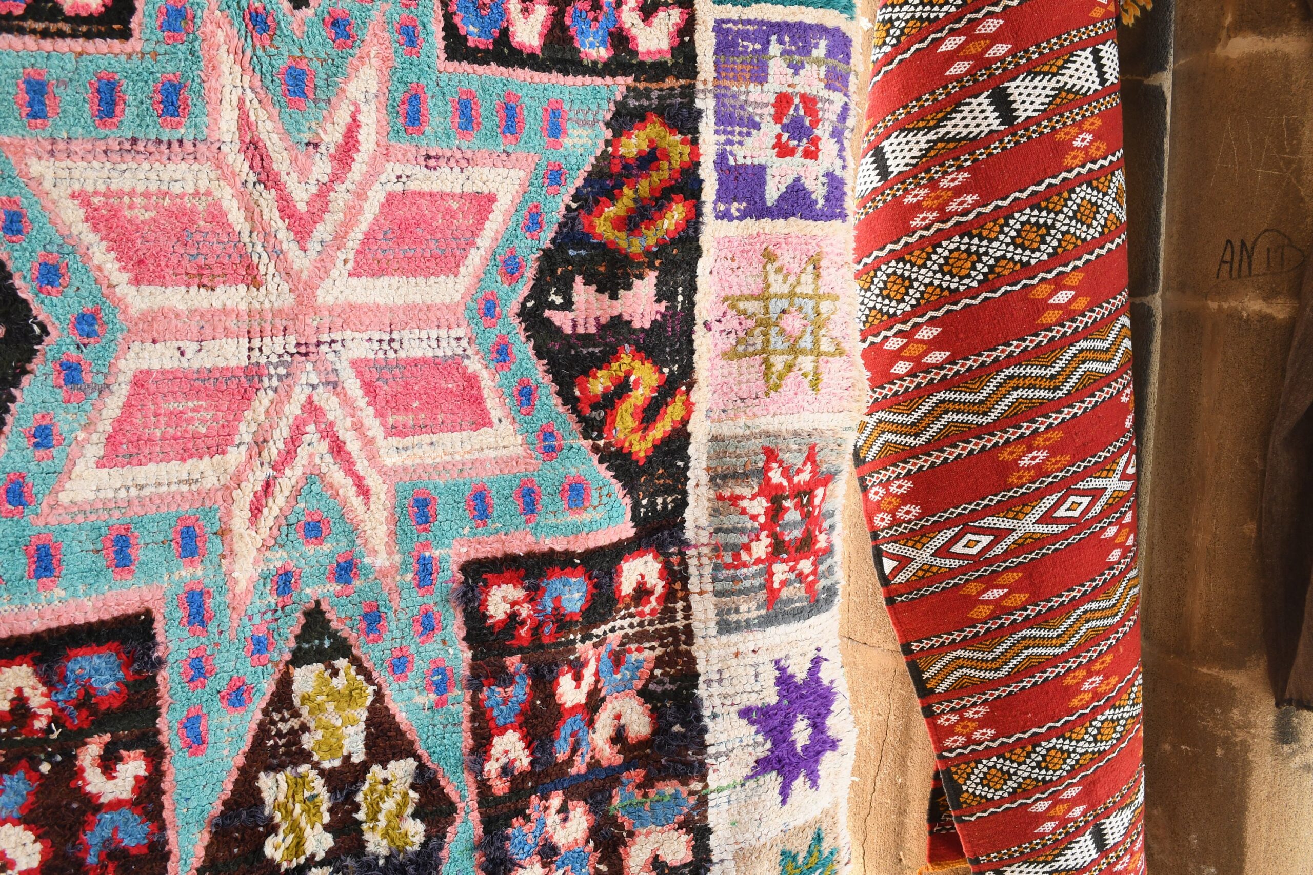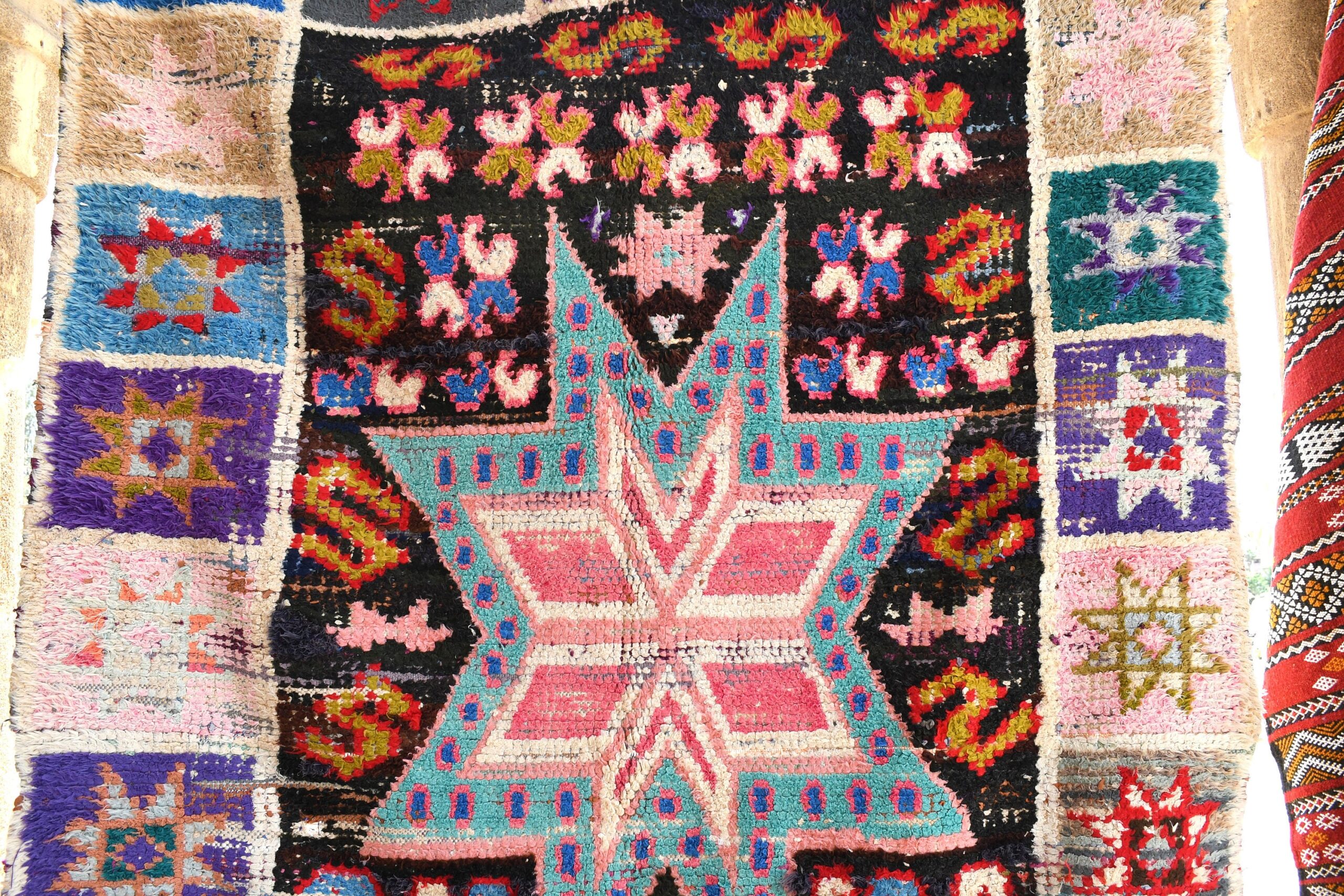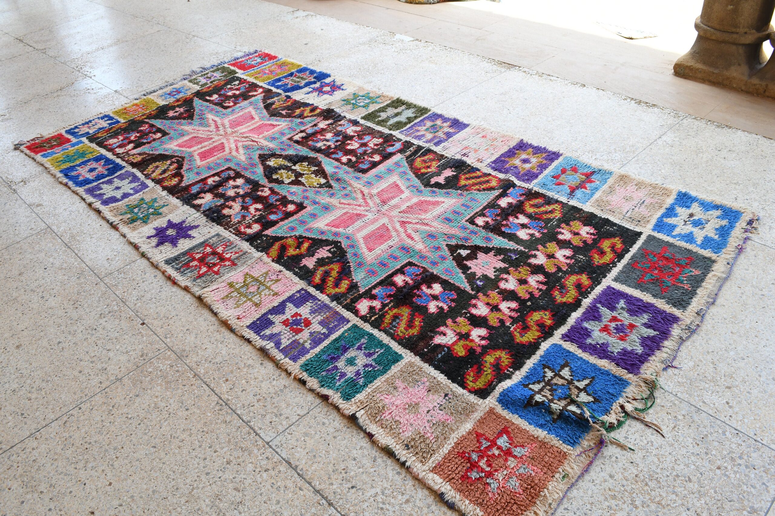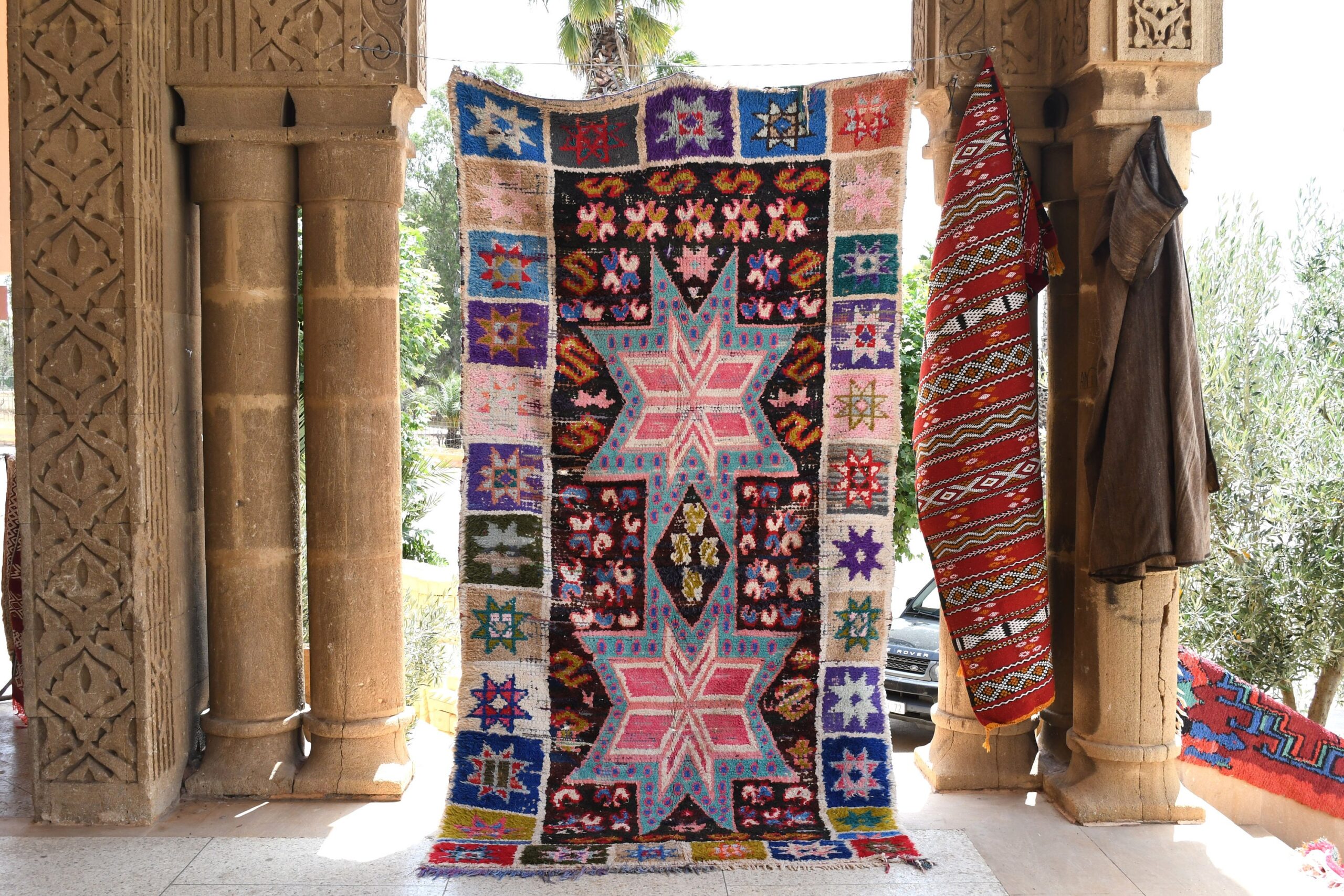 Indulge in the captivating artistry of this Vintage Moroccan rug from WeBerber. Handwoven by skilled artisans using centuries-old techniques, this Boucherouite rug is a testament to the rich cultural heritage of Morocco. Each intricate knot tells a unique story, adding depth and character to its design. Crafted from a blend of soft wool and durable cotton, this rug promises both comfort and longevity. Its vibrant colors and bold geometric patterns will effortlessly transform any room into a bohemian paradise. Whether used as a statement piece in your living room or a cozy accent in your bedroom, this Boucherouite rug is sure to become a cherished heirloom. Embrace the allure of authenticity and immerse yourself in the beauty of Moroccan craftsmanship with this exceptional piece.