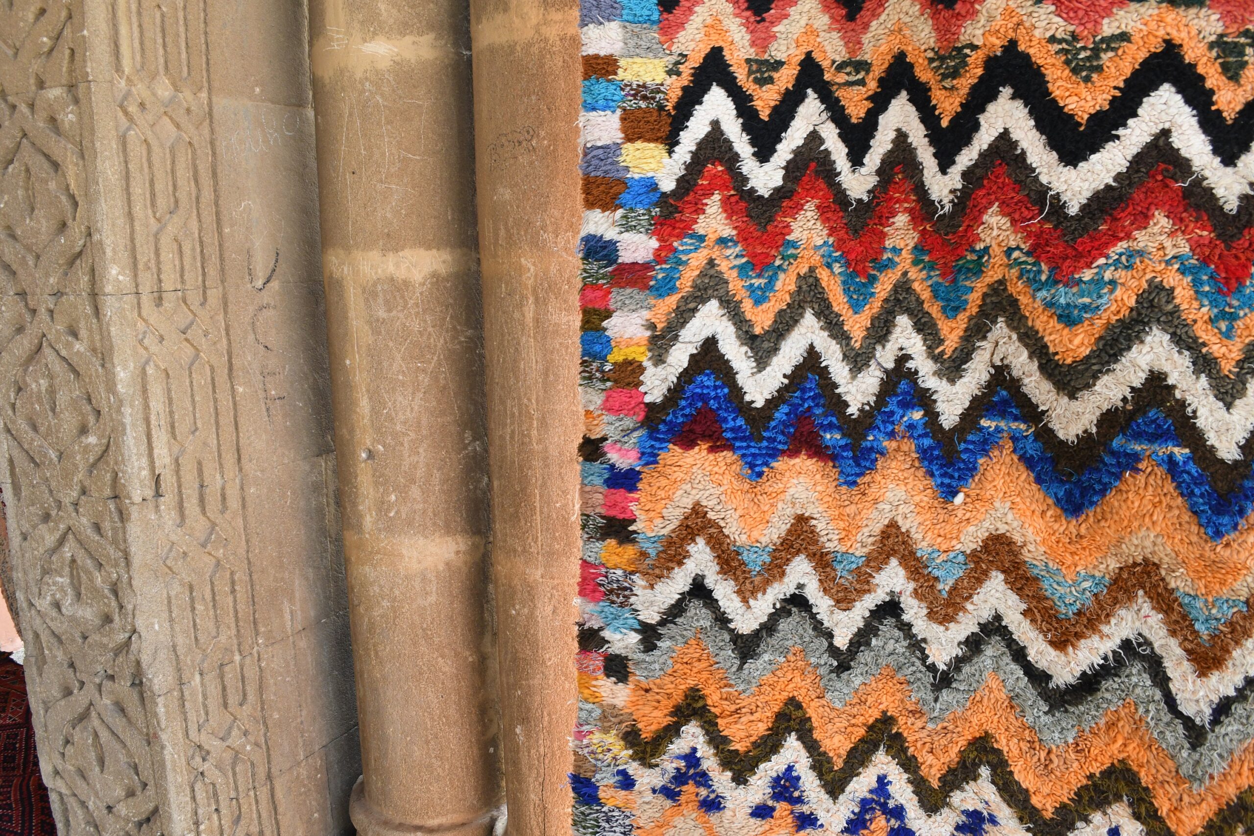 a colorful rug is hanging on a wall. il_fullxfull.6076150931_mbcz.jpgMoroccan Rug: Vintage Moroccan rug, Premium Berber Design 320 cm x 202 cm / 10.24ft x 6.464 ft