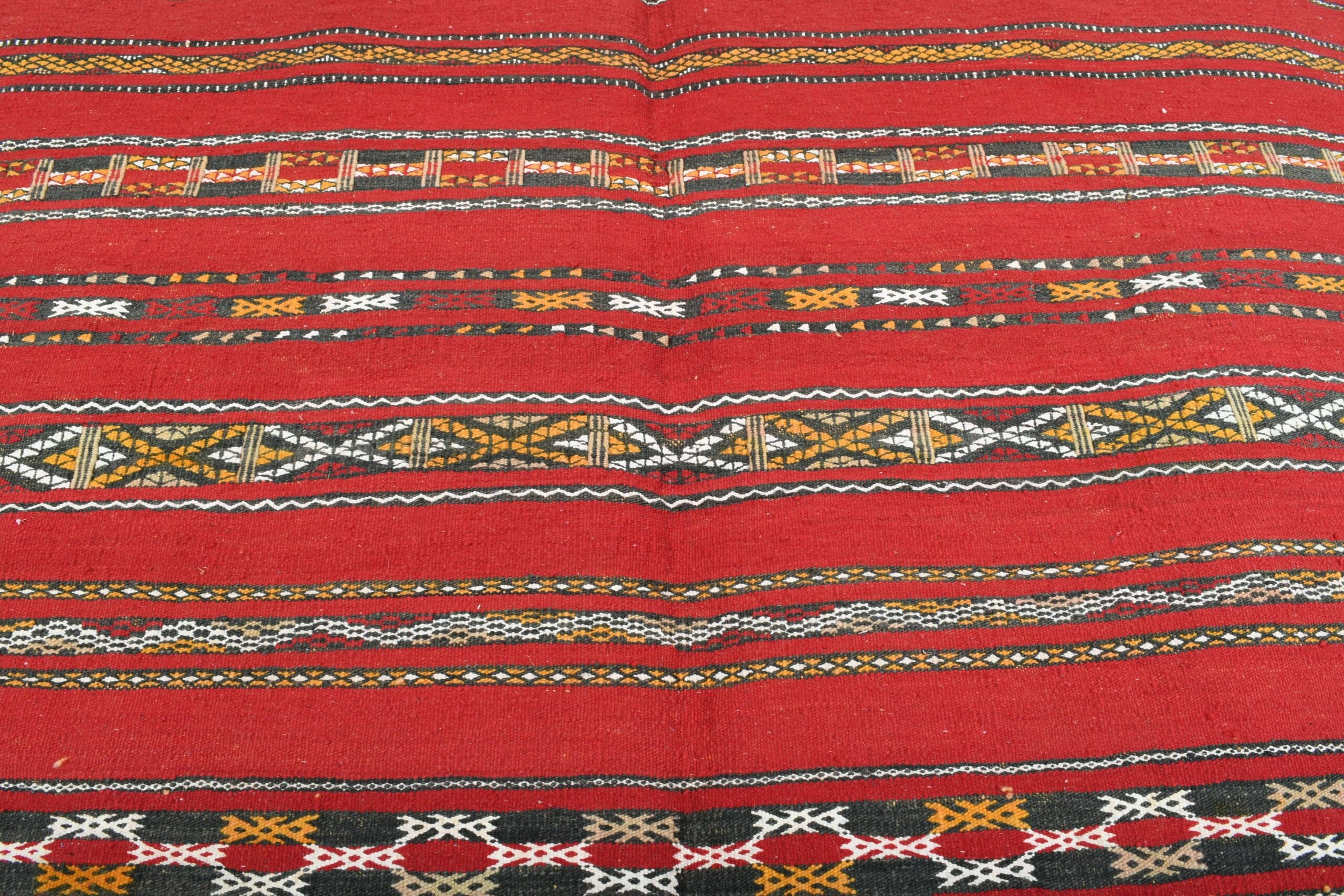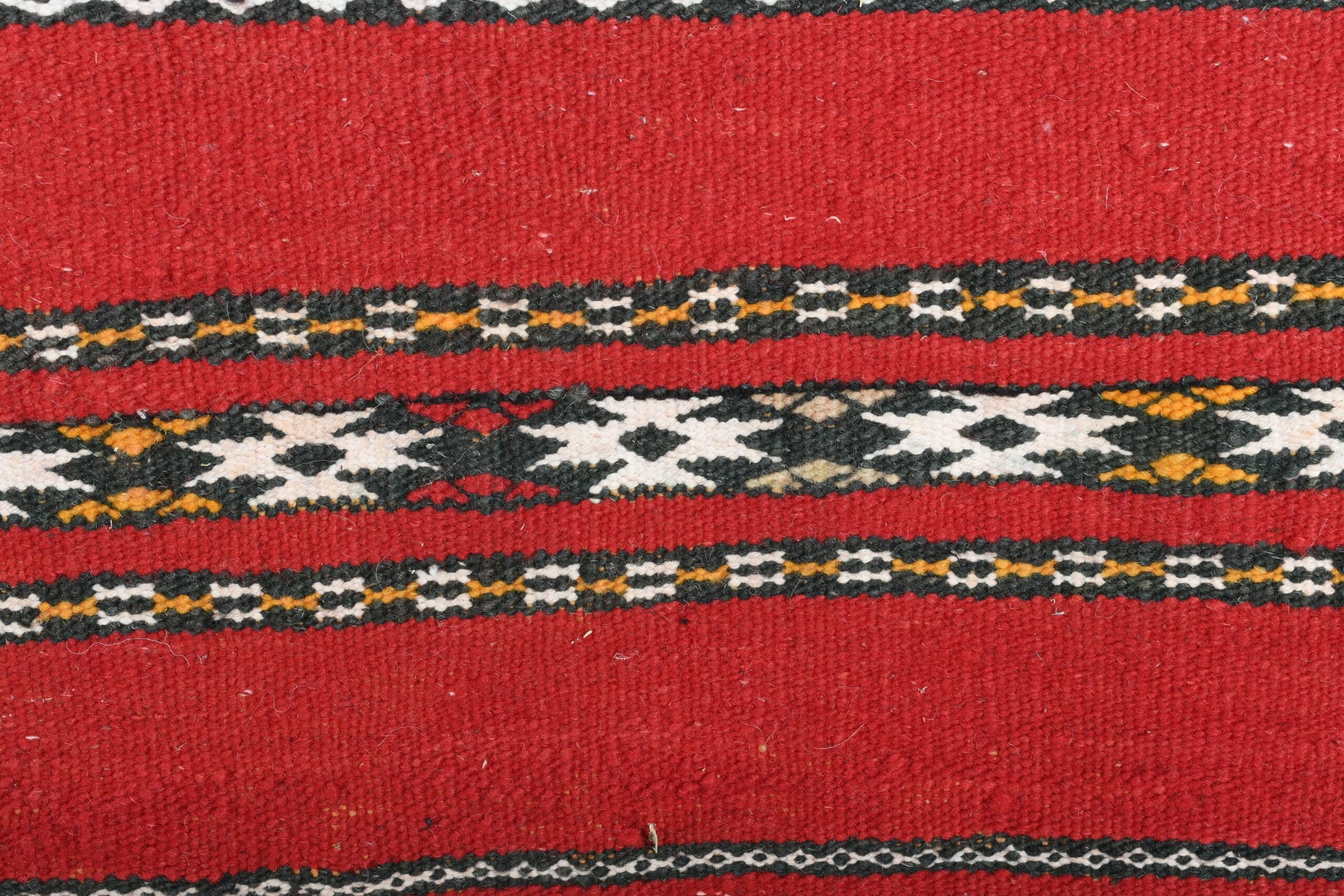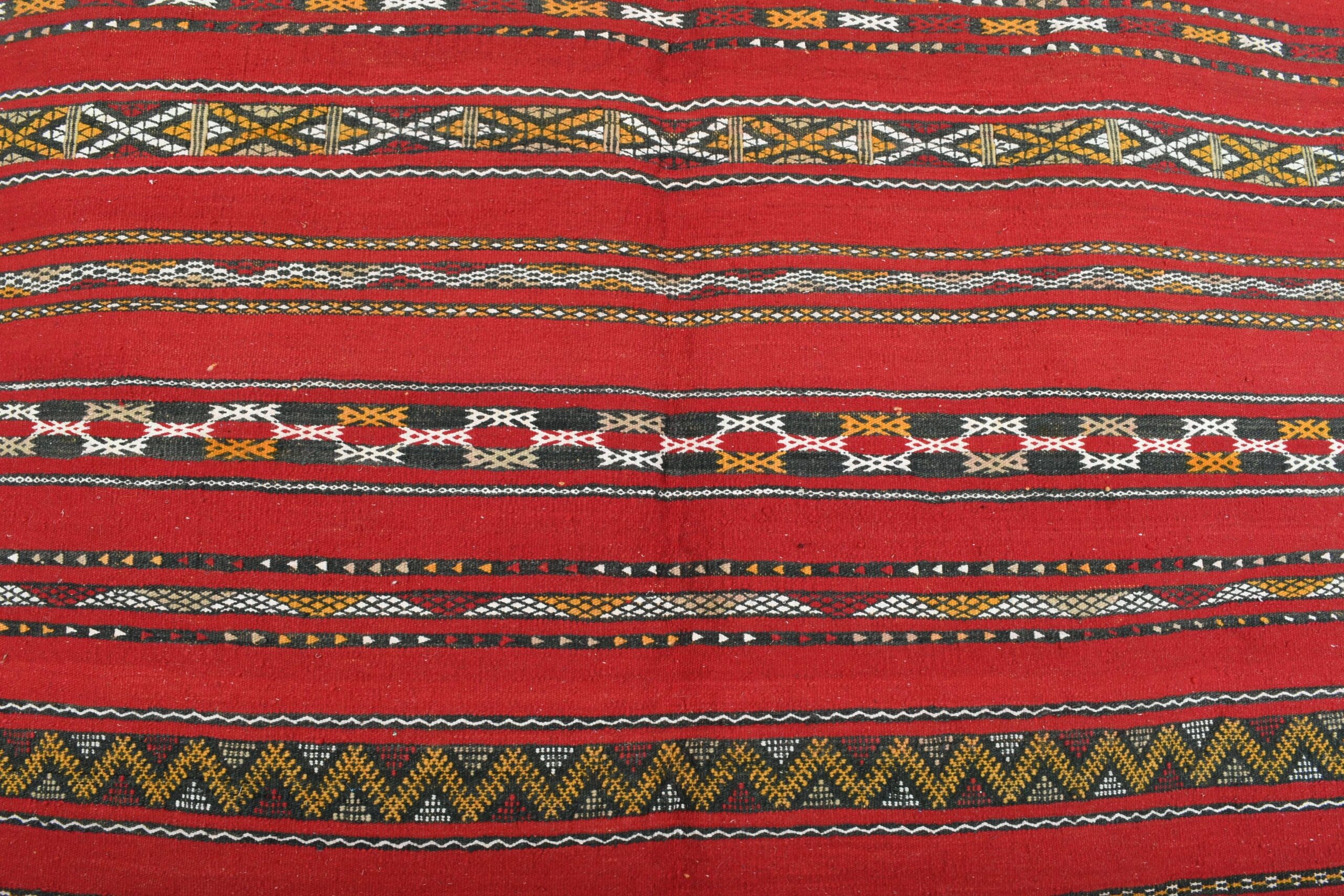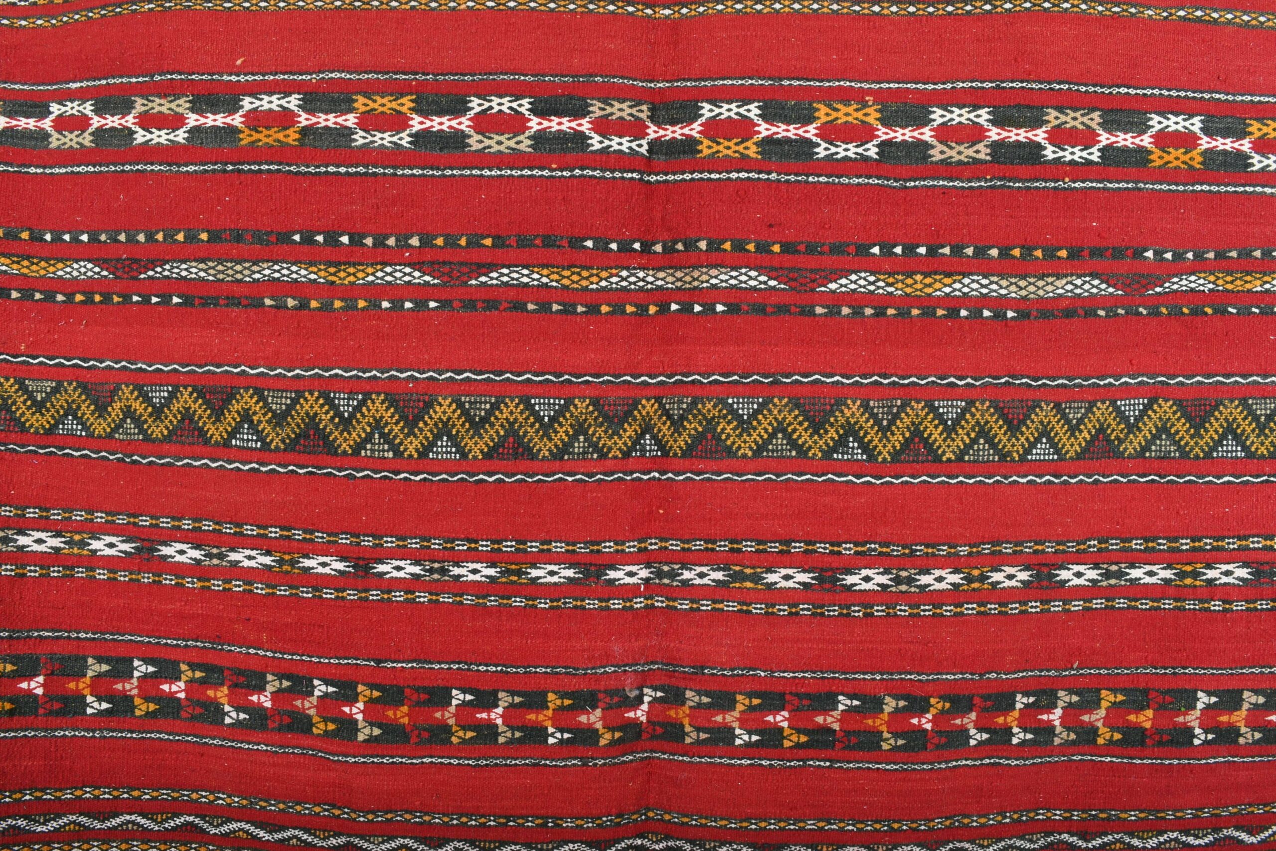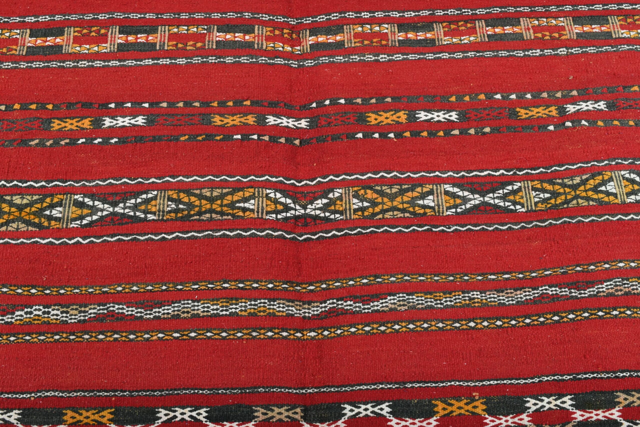 The rug’s vibrant color palette is dominated by a deep, luxurious red, complemented by accents of black, white, and earthy tones. These colors are expertly interwoven to create a dynamic and engaging visual experience. The bold red serves as a striking backdrop, while the contrasting hues enhance the intricate motifs, making this rug a standout piece in any setting.