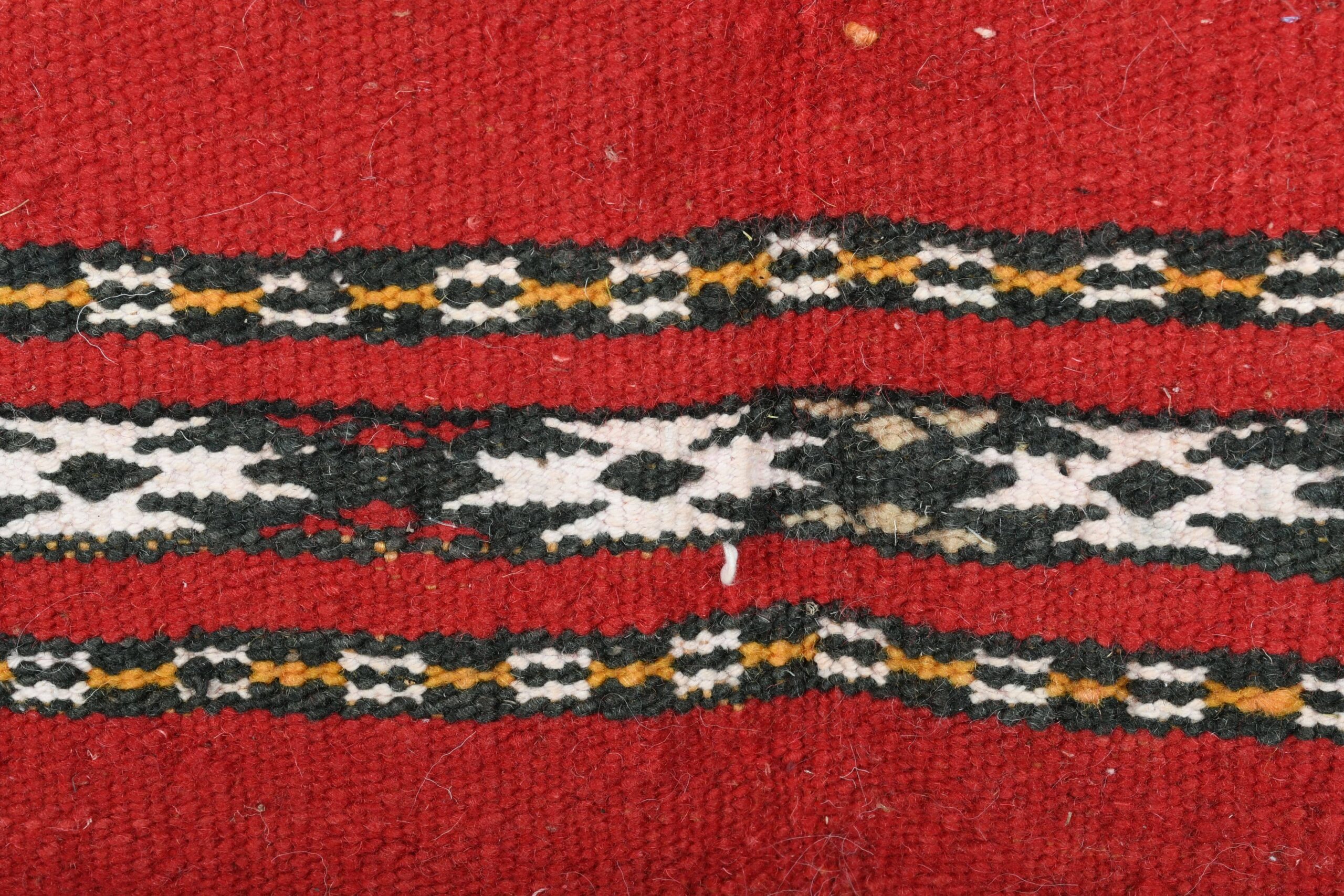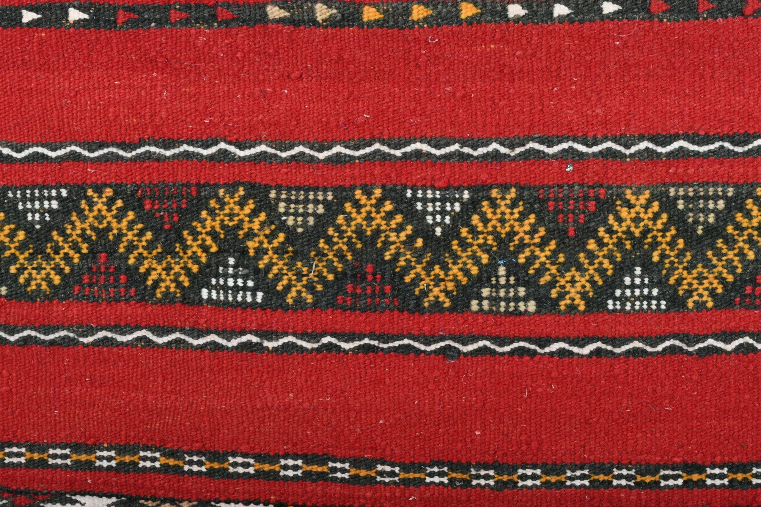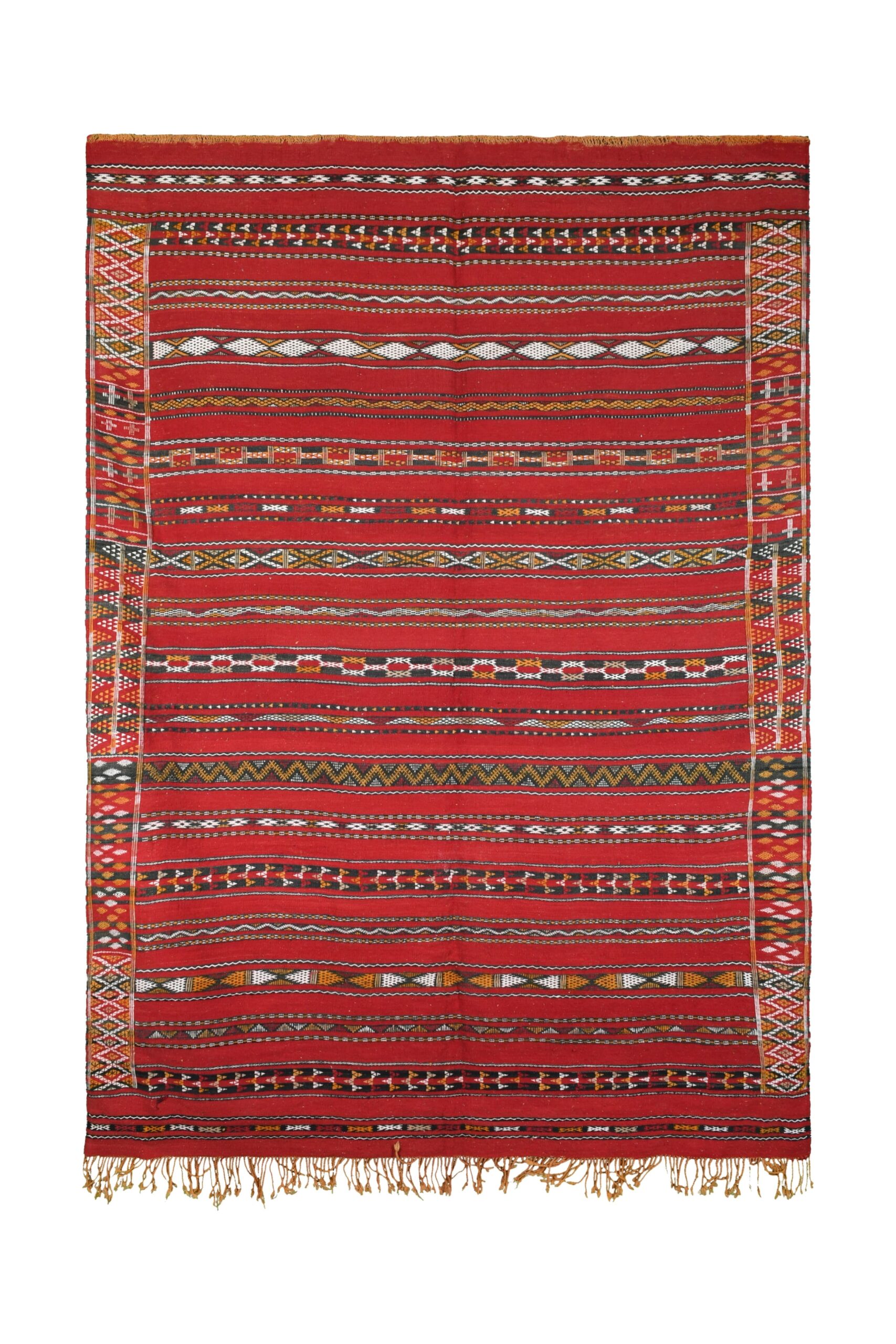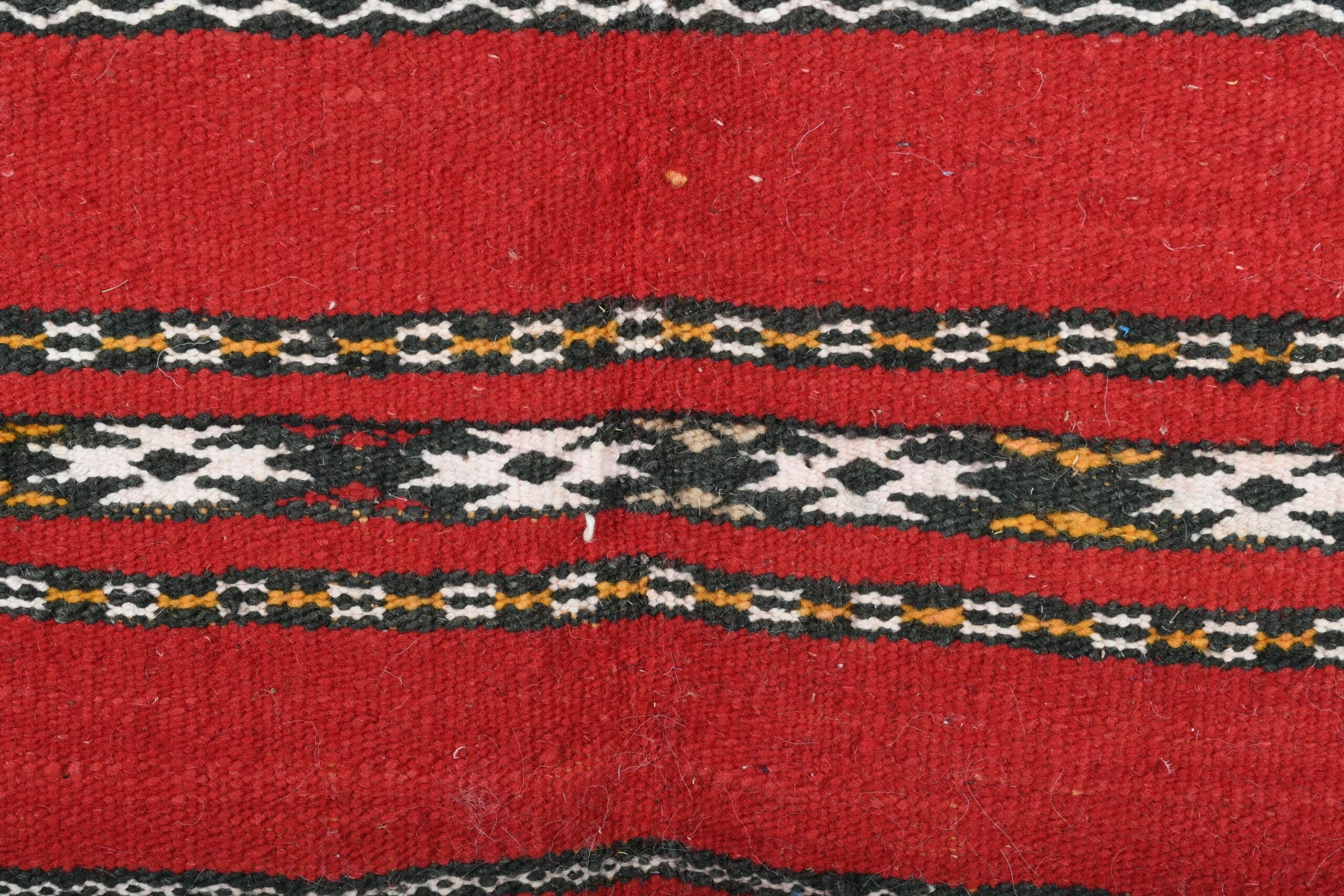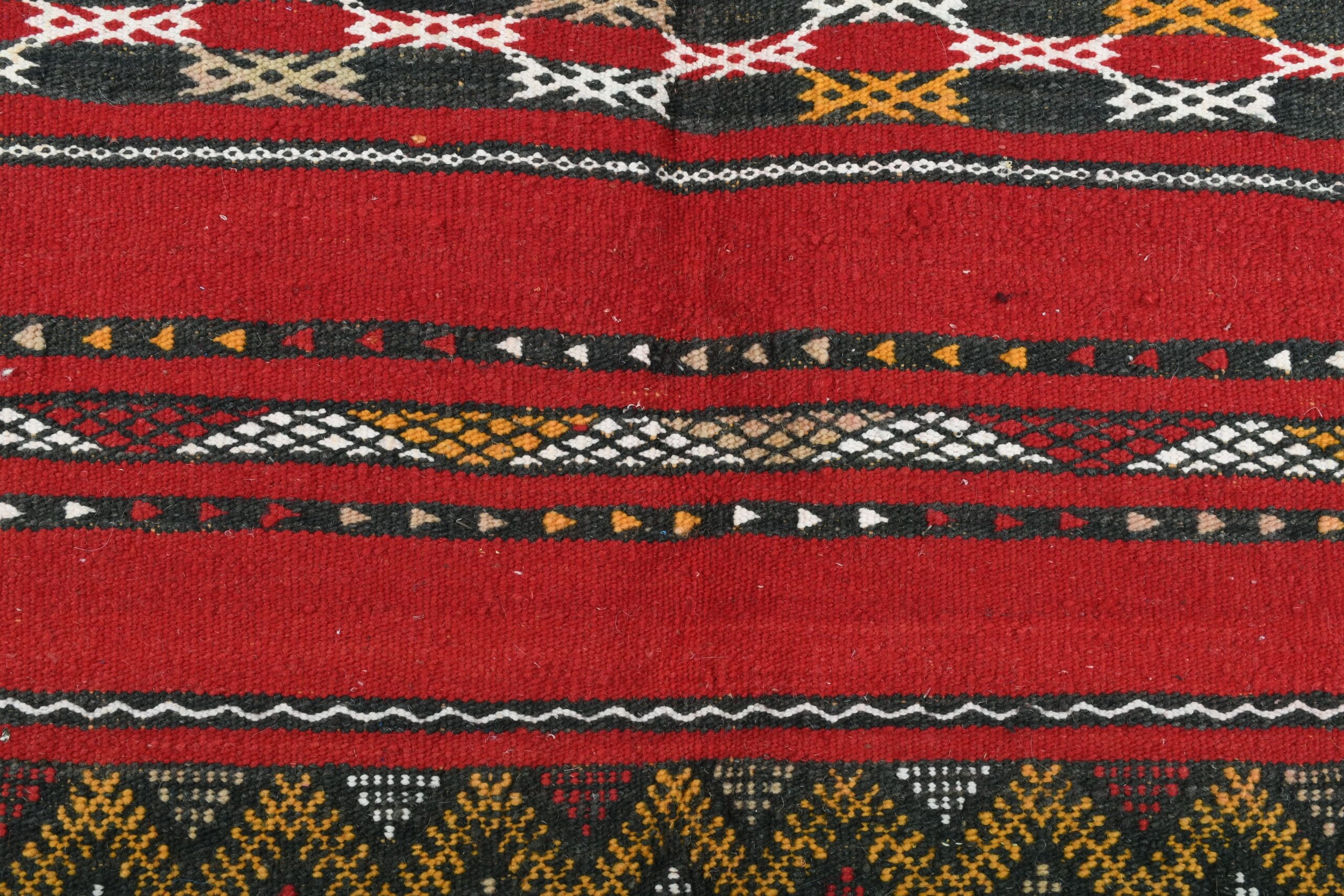 The rug’s vibrant color palette is dominated by a deep, luxurious red, complemented by accents of black, white, and earthy tones. These colors are expertly interwoven to create a dynamic and engaging visual experience. The bold red serves as a striking backdrop, while the contrasting hues enhance the intricate motifs, making this rug a standout piece in any setting.